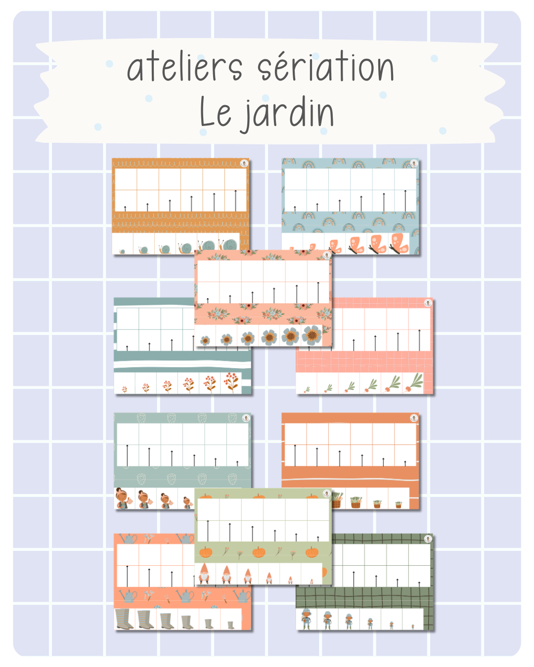 10 ateliers de sériation croissants-décroissants sur le thème « Au jardin » pour observer, comparer et ranger les éléments selon leur taille dans un univers visuel clair, ludique et structuré.