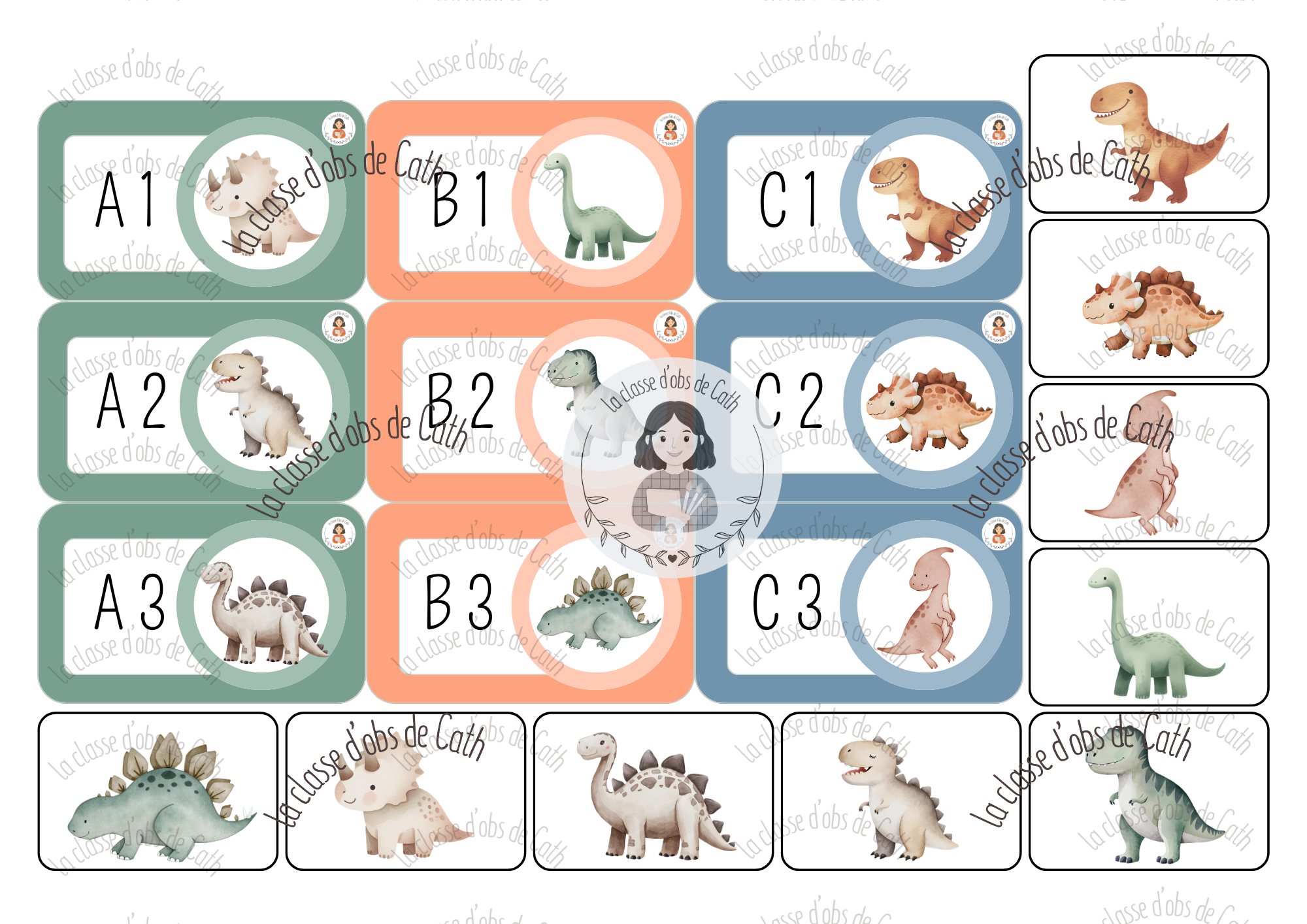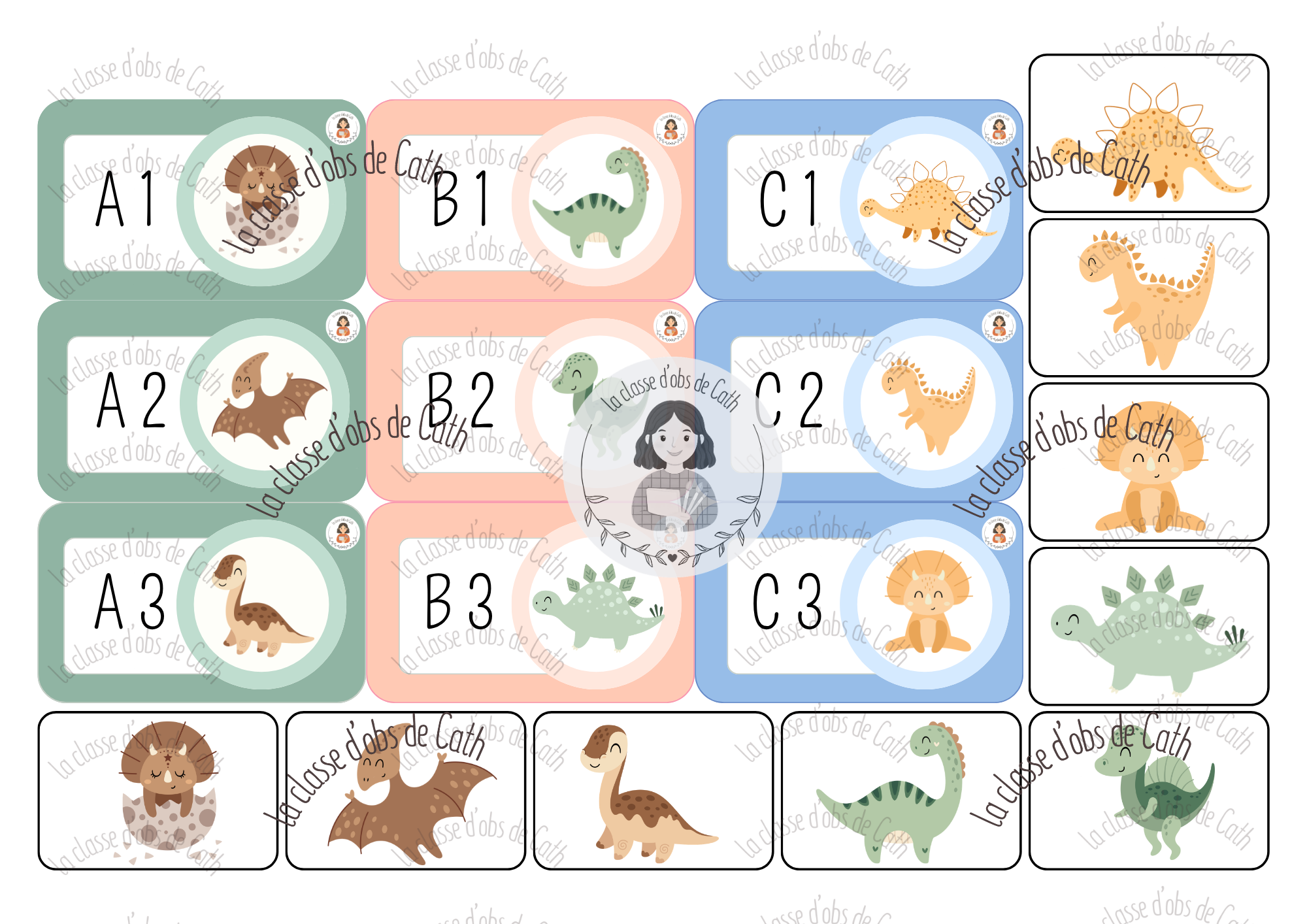 Lire et utiliser des coordonnées (lettre + chiffre), se repérer dans un tableau à double entrée, associer une position à une carte image, développer la logique spatiale et l’organisation, discrimination visuelle entre différents dinosaures, suivre une consigne précise et séquentielle.