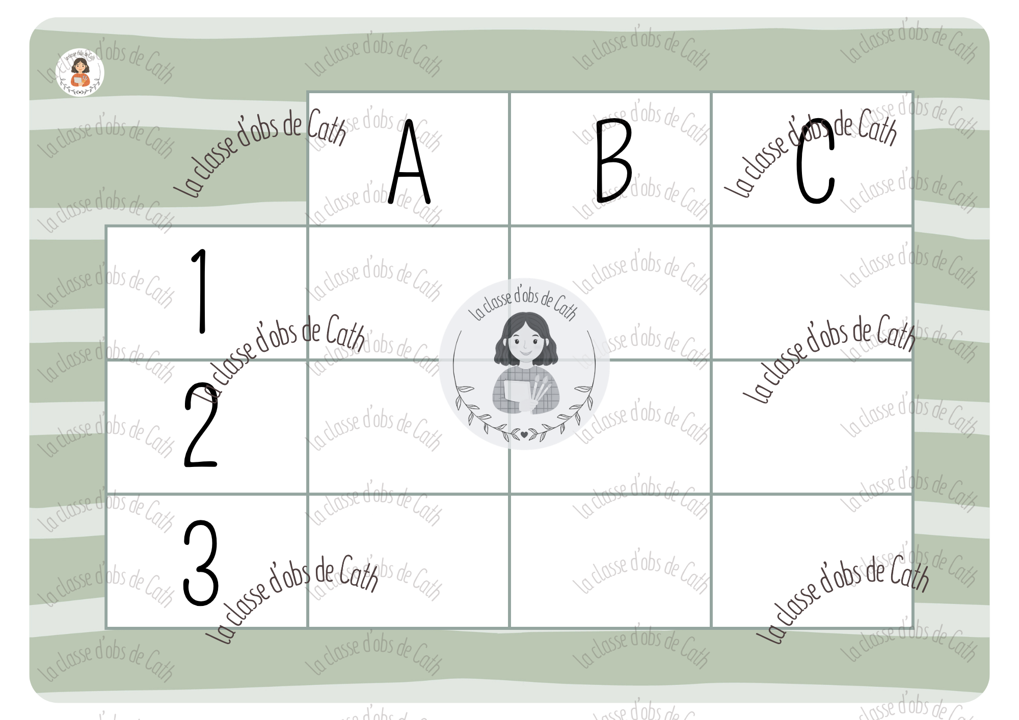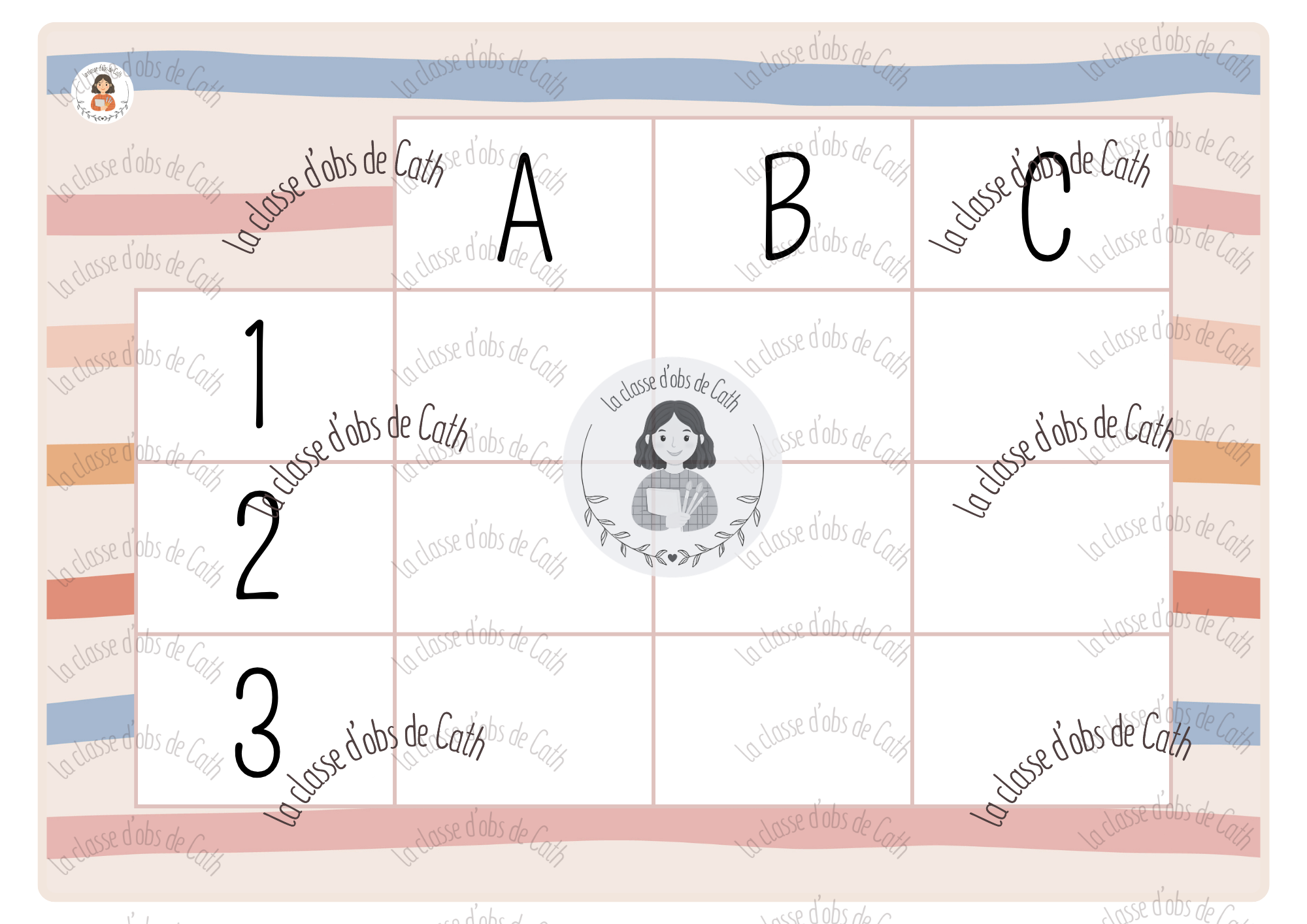 Les 2 tableaux sont dans des palettes différentes, avec 2 séries de 9 cartes codées (A1 à C3). Particulièrement adapté aux enfants TND grâce au codage visuel clair et à la manipulation concrète.