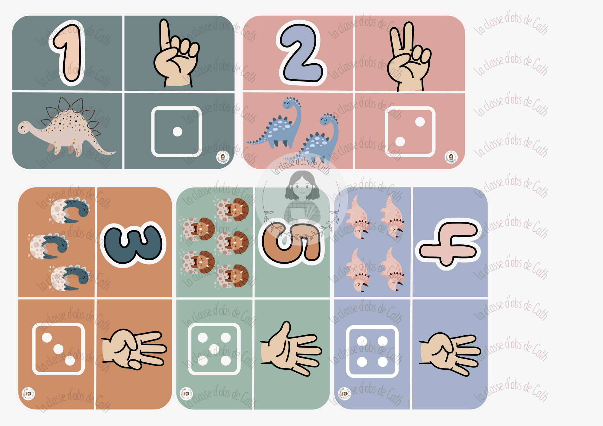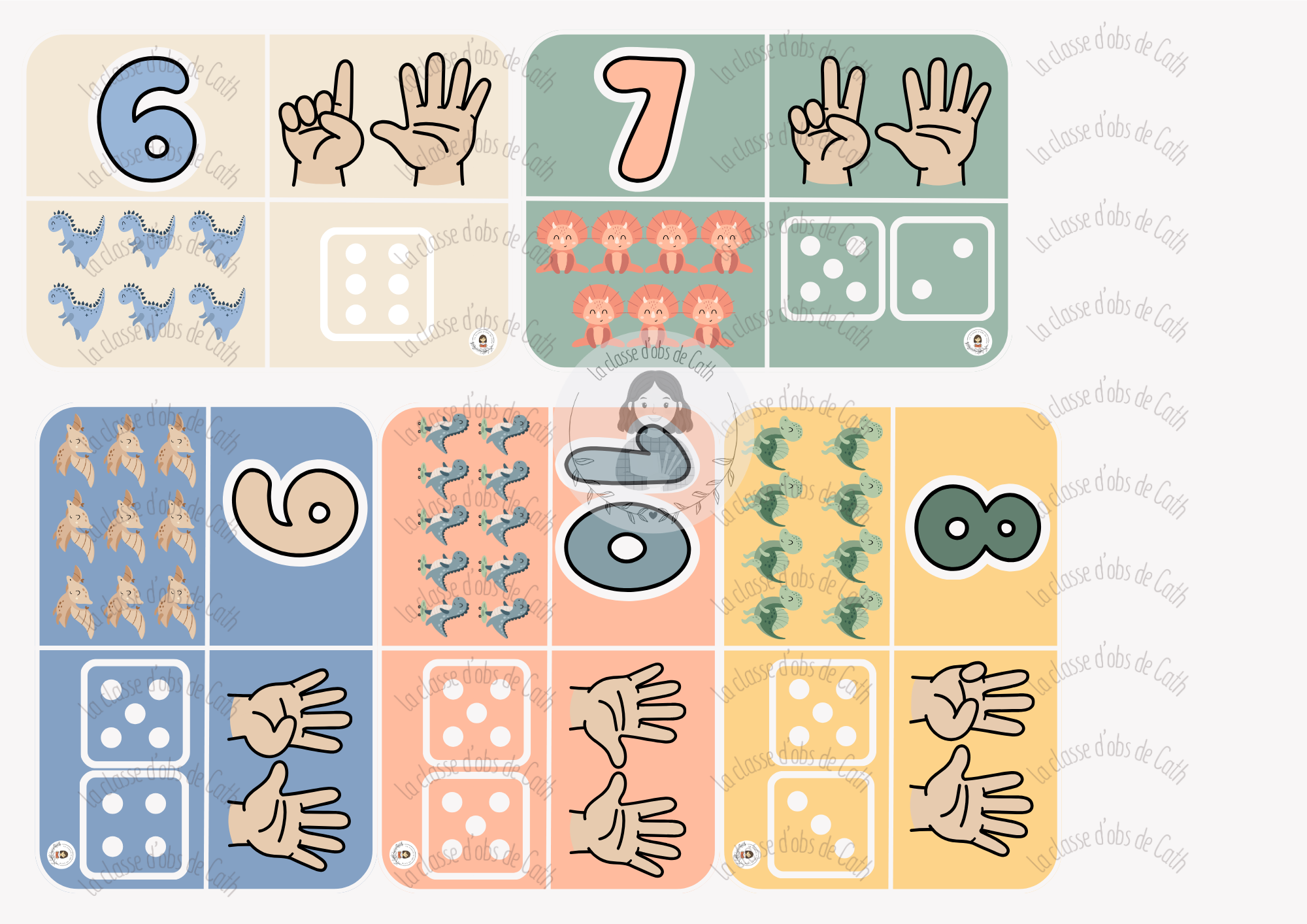 Cartes à compter de 1 à 10 sur le thème des dinosaures. Chaque carte propose plusieurs représentations simultanées du nombre : le chiffre, les doigts, les constellations de dé et une collection de dinosaures à dénombrer. Cette approche multi-représentation favorise la construction du sens du nombre et les liens entre les différentes écritures numériques.