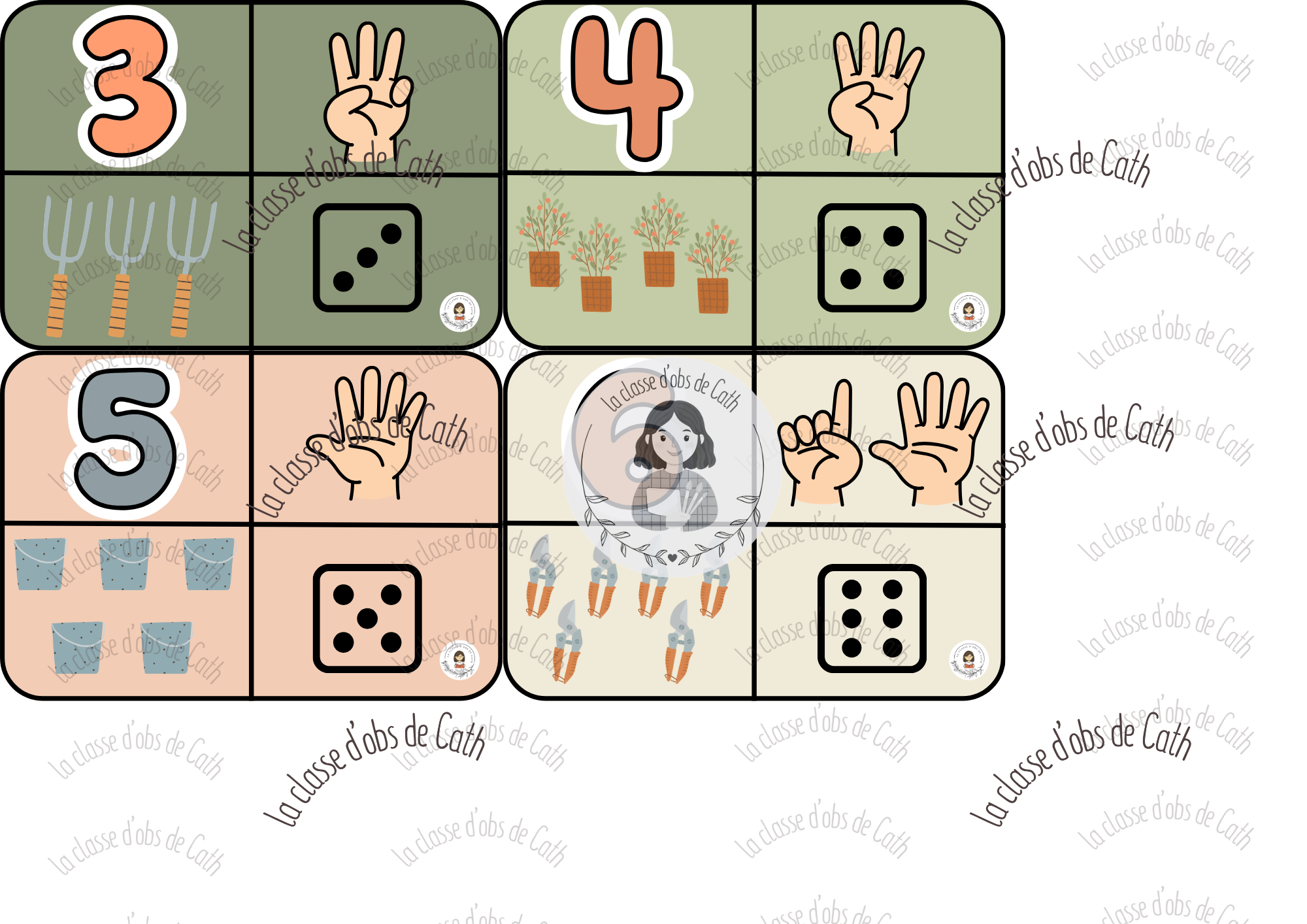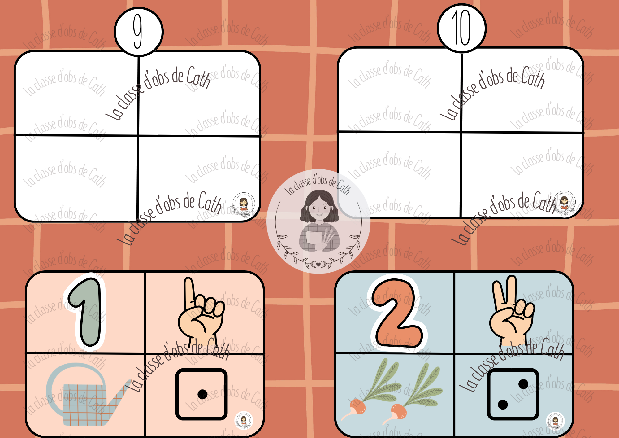 Cartes à compter de 1 à 10 sur le thème « Au jardin ». Chaque carte propose plusieurs représentations simultanées du nombre : le chiffre, les doigts, les constellations de dé et une collection d’images thématiques. Cette approche multi-représentation favorise la construction du sens du nombre et les liens entre les différentes écritures numériques.