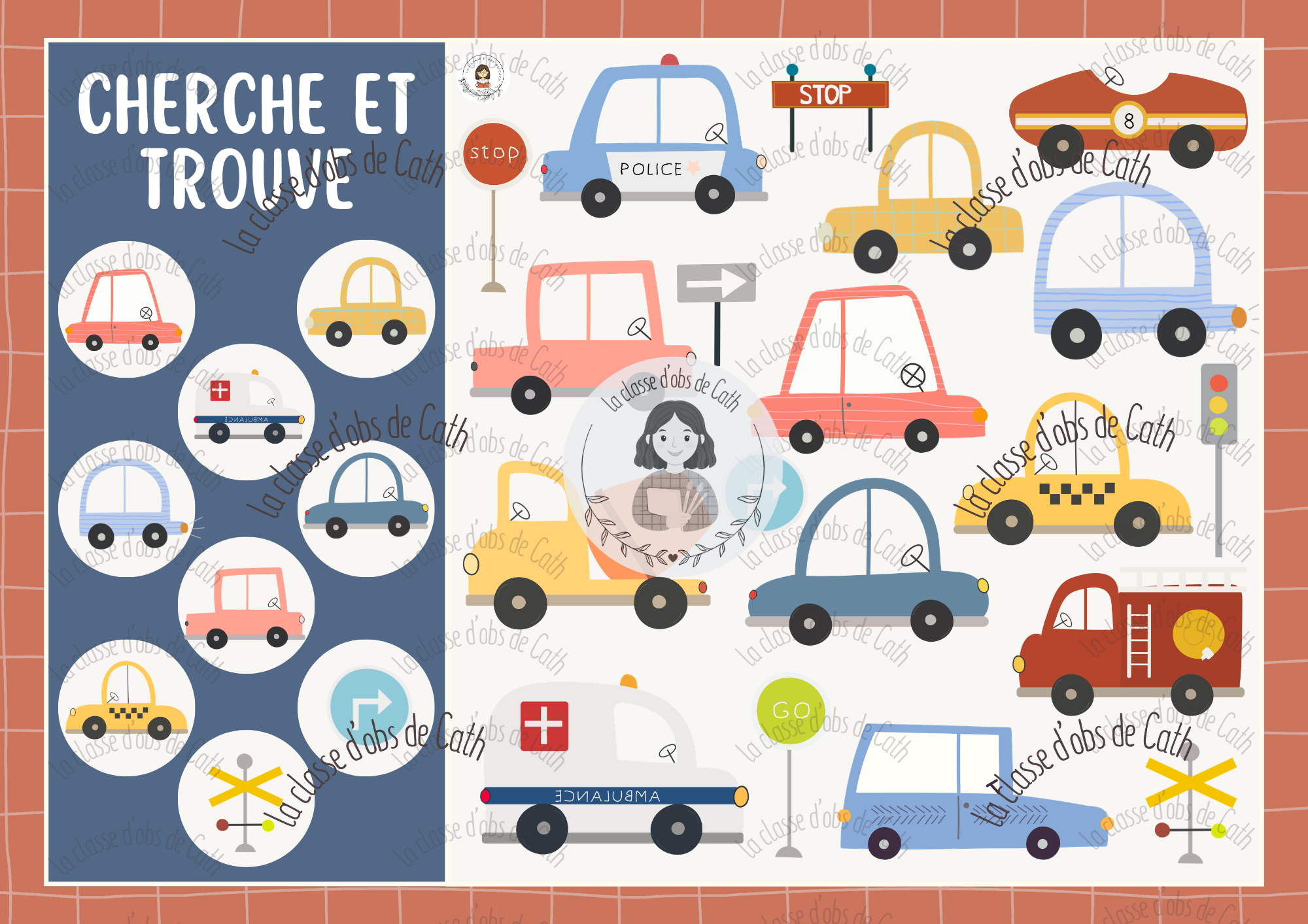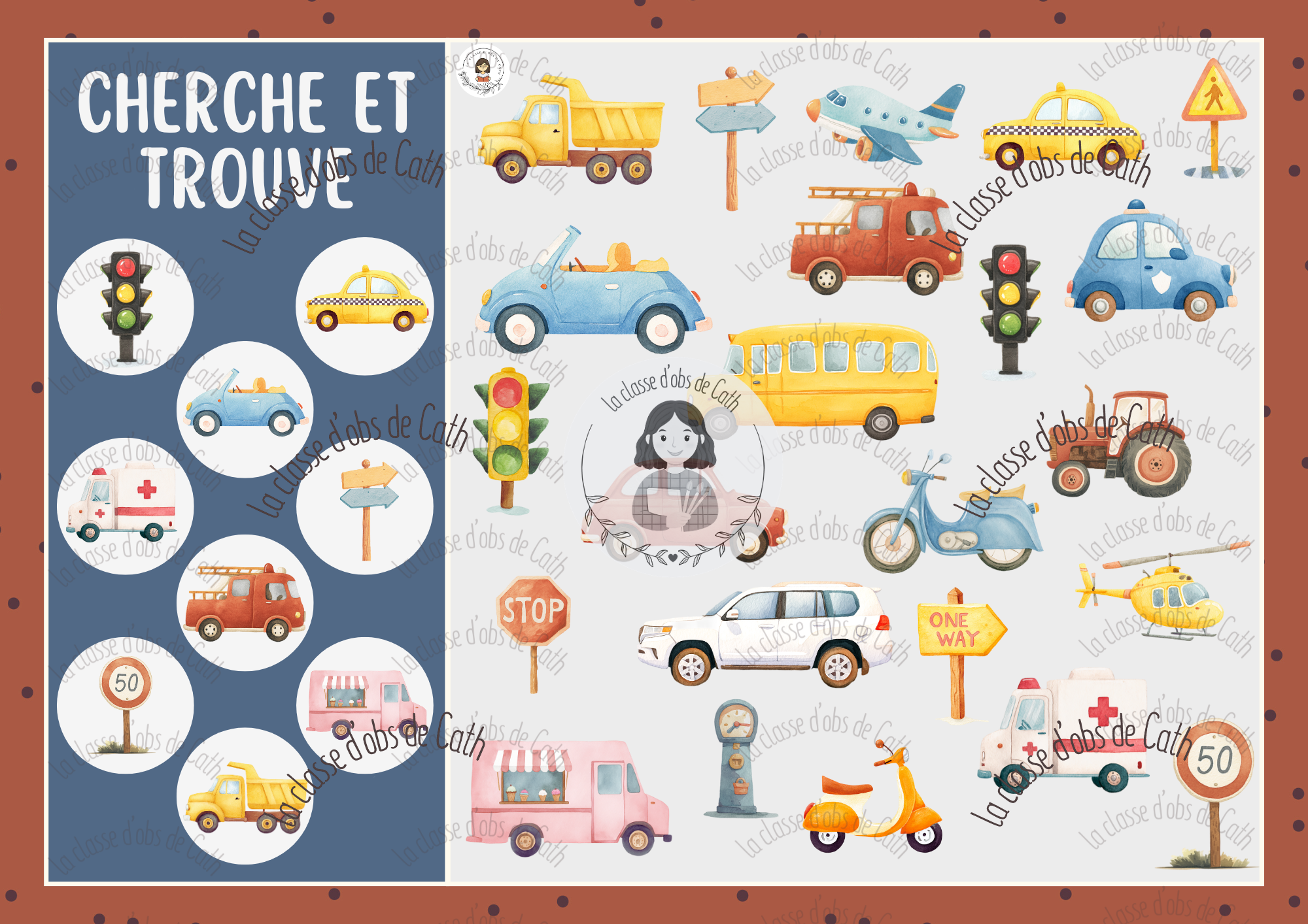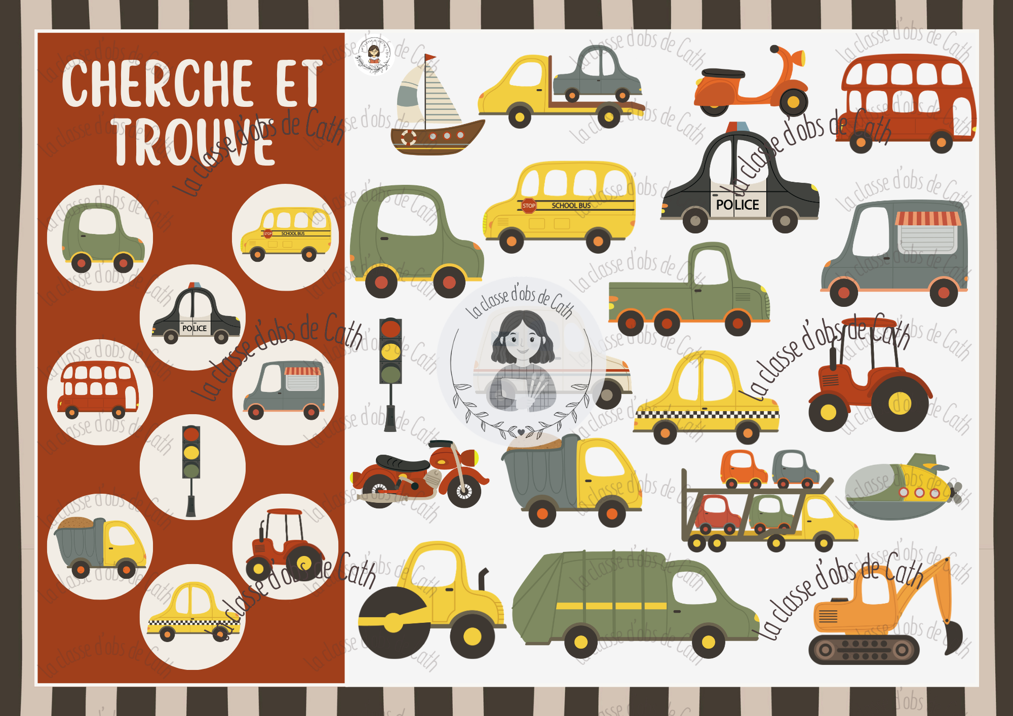8 jeux cherche et trouve sur le thème des véhicules pour observer, retrouver et associer différents éléments dans un support visuel clair, ludique et stimulant.