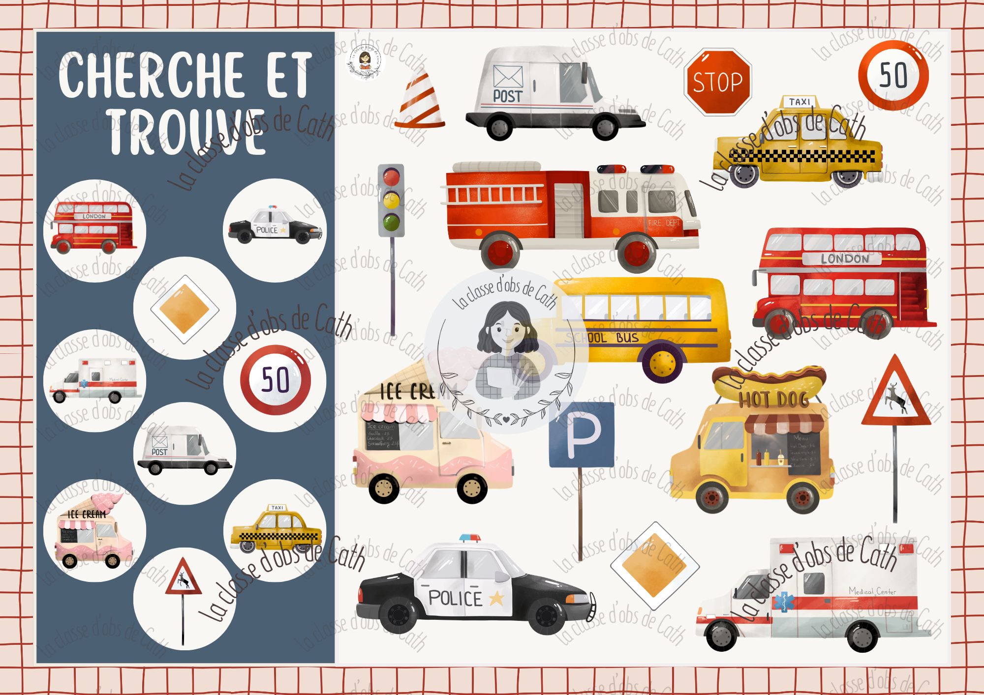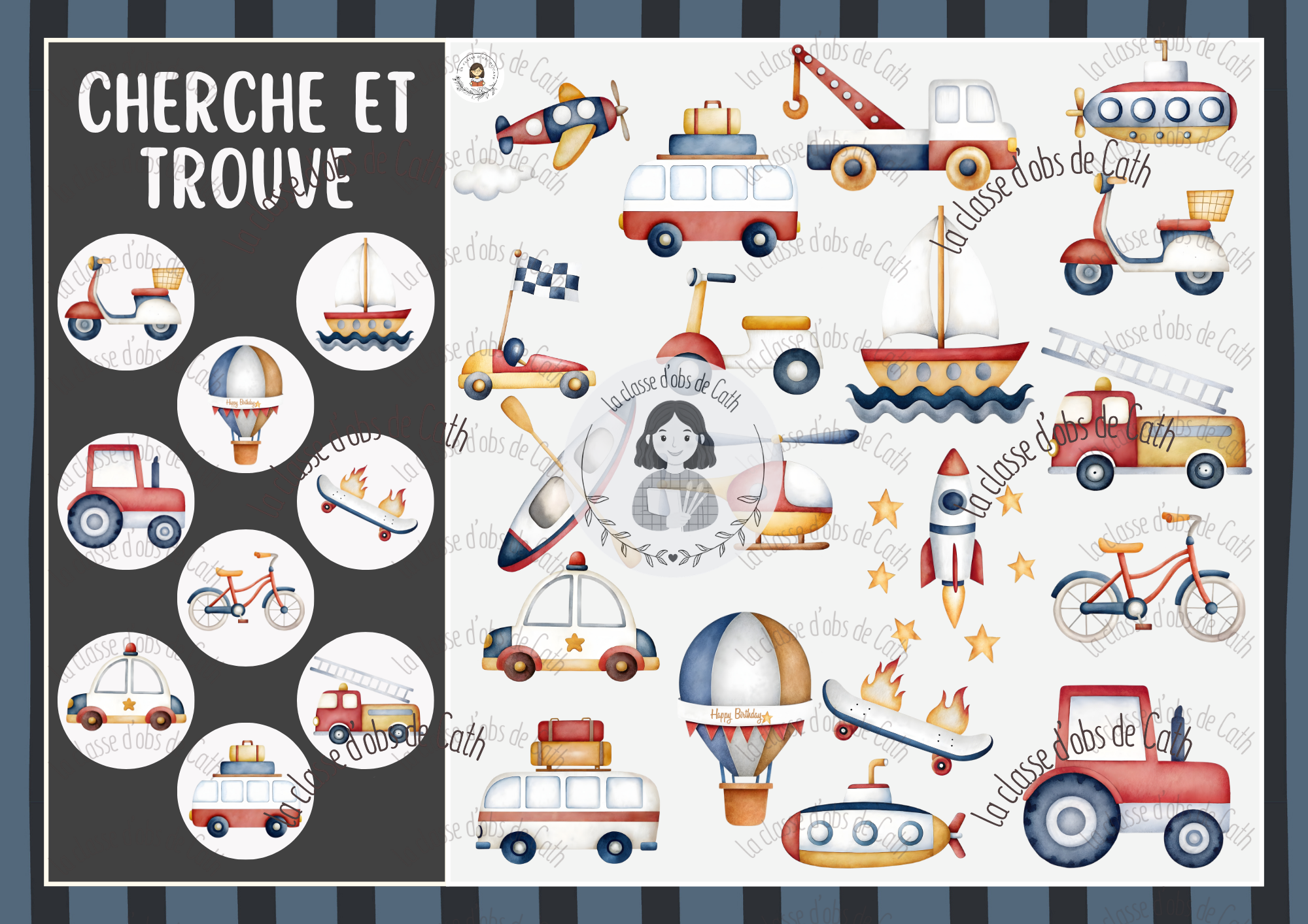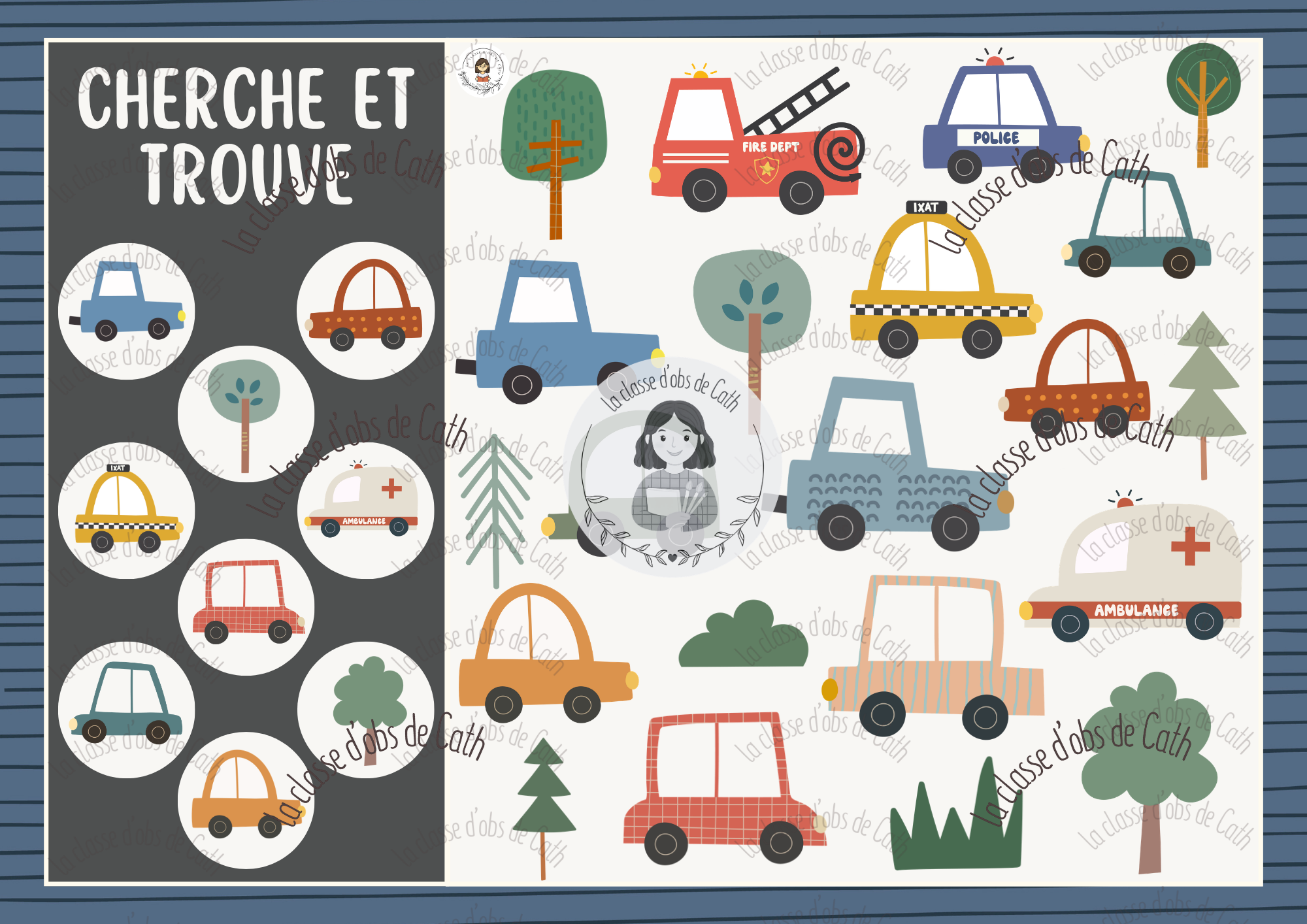 8 jeux cherche et trouve sur le thème des véhicules pour observer, retrouver et associer différents éléments dans un support visuel clair, ludique et stimulant.