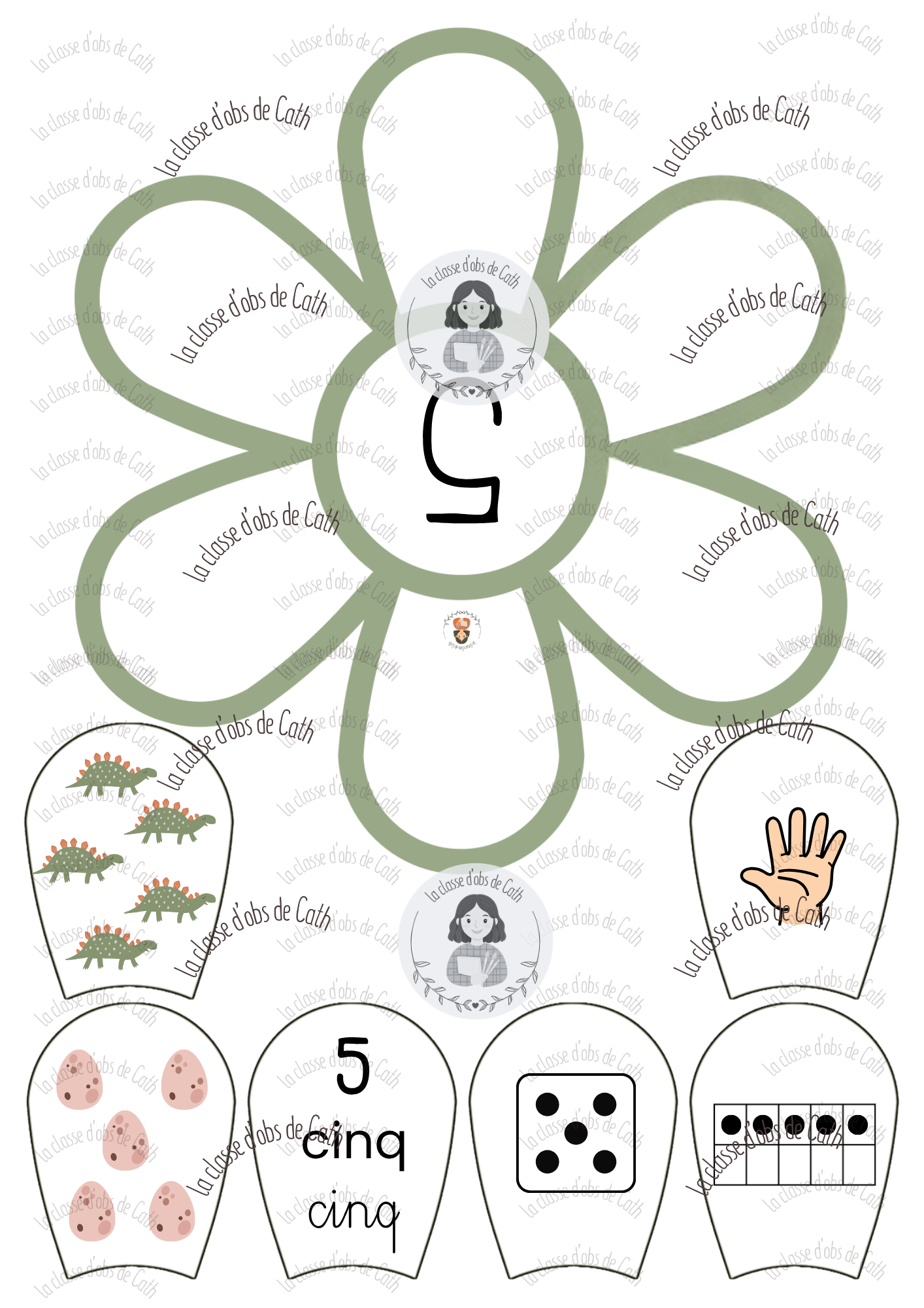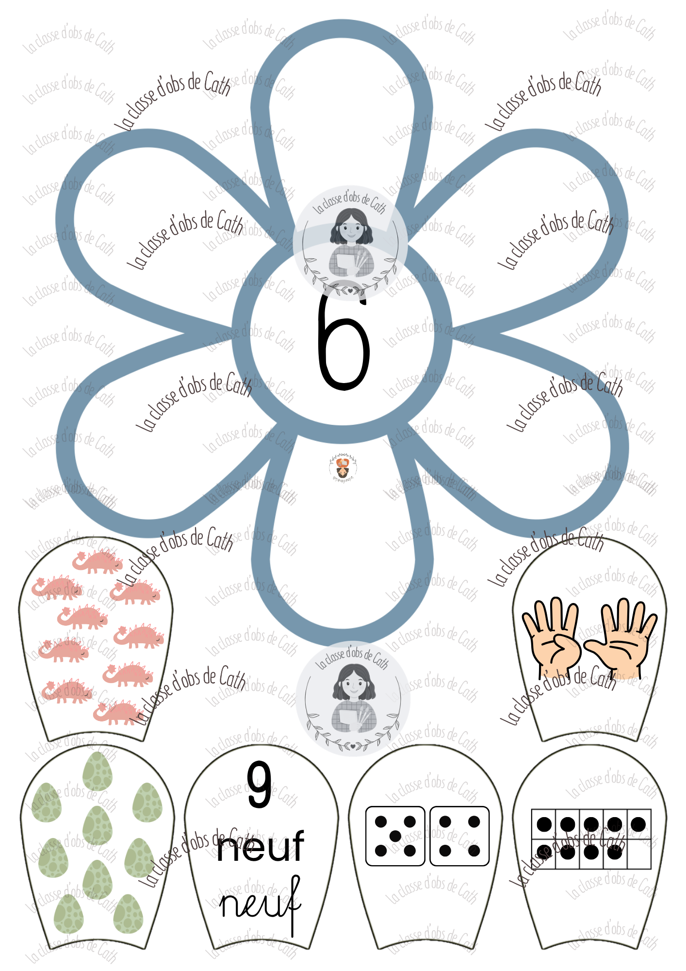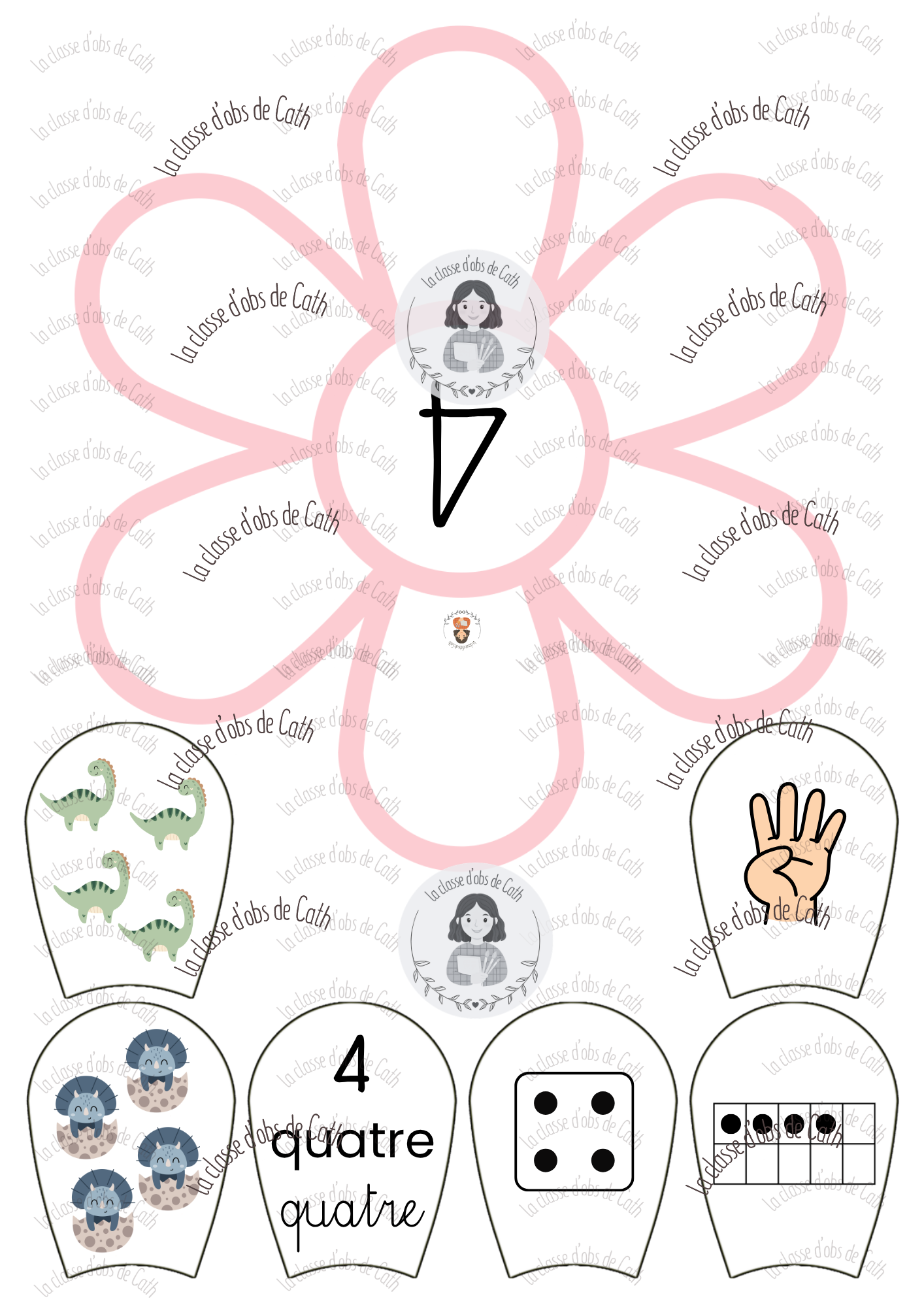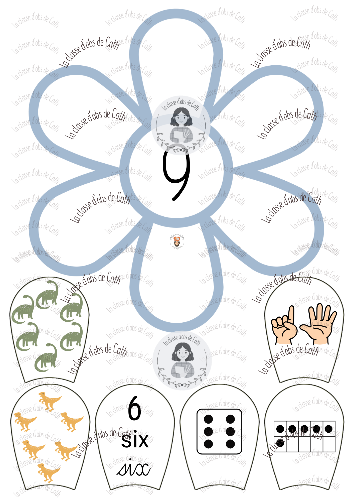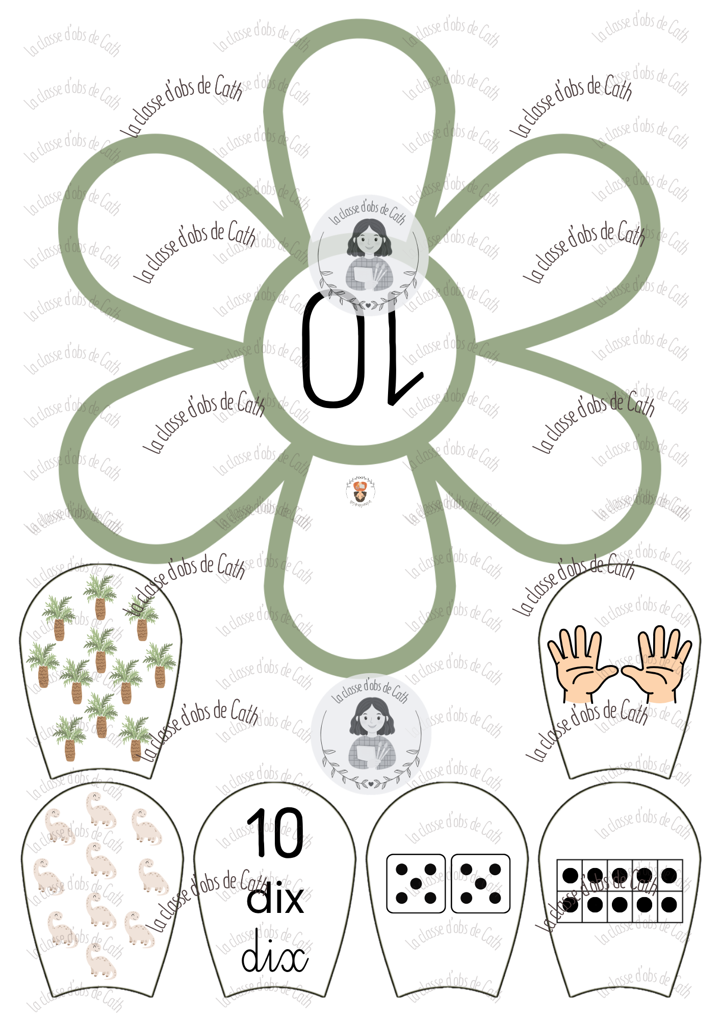 10 fleurs à compter de 1 à 10 sur le thème des dinosaures. Chaque fleur porte un chiffre au centre — l’enfant place les pétales correspondants autour de la fleur en associant les différentes représentations du nombre : collection de dinosaures, geste de la main, chiffre écrit, nom du nombre en lettres, constellation de dé et tableau à points.