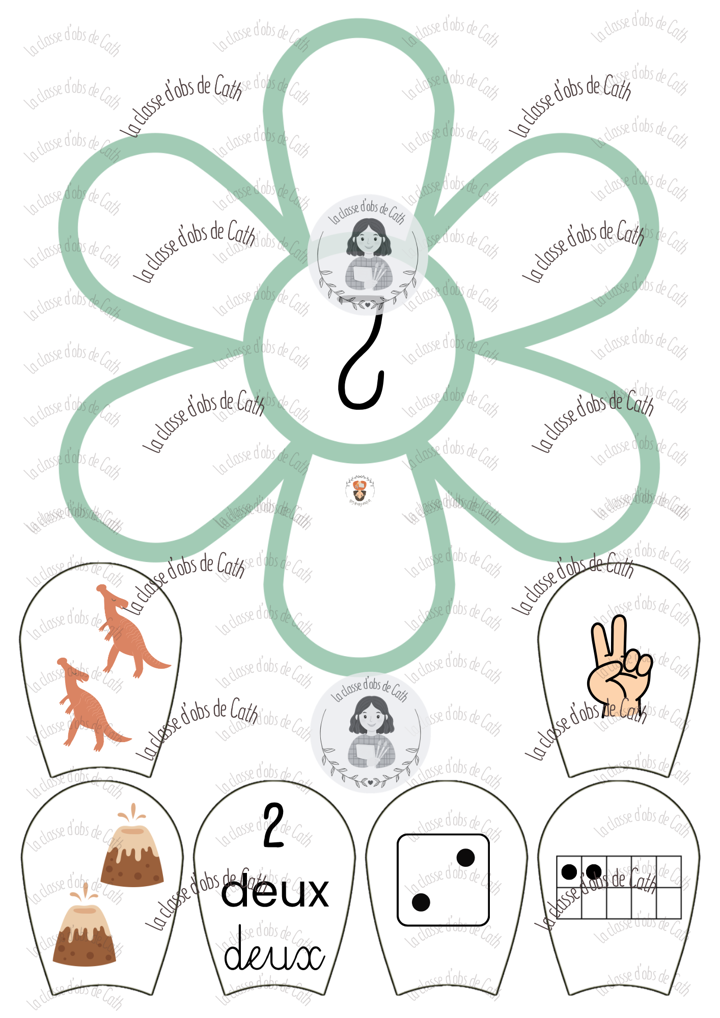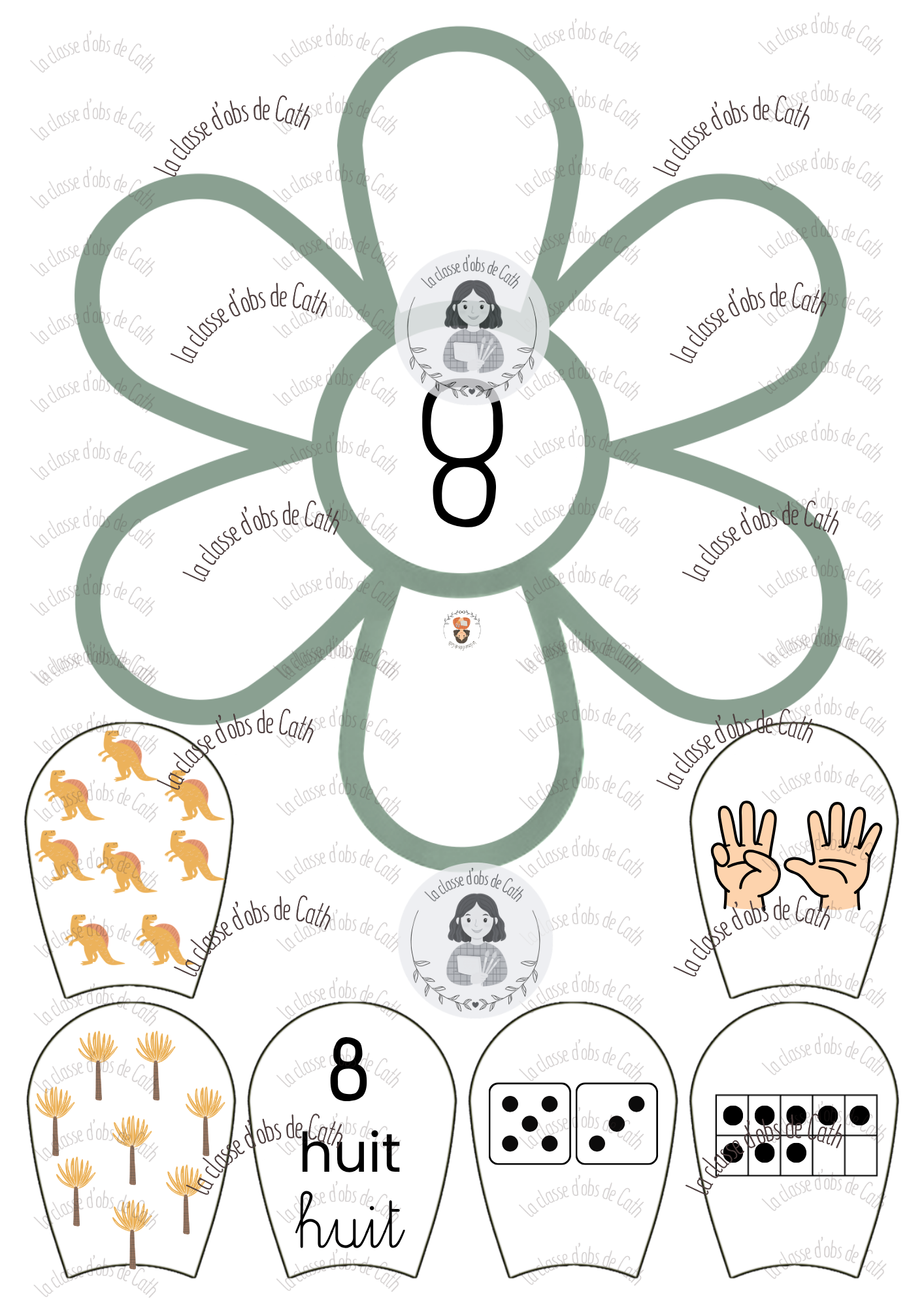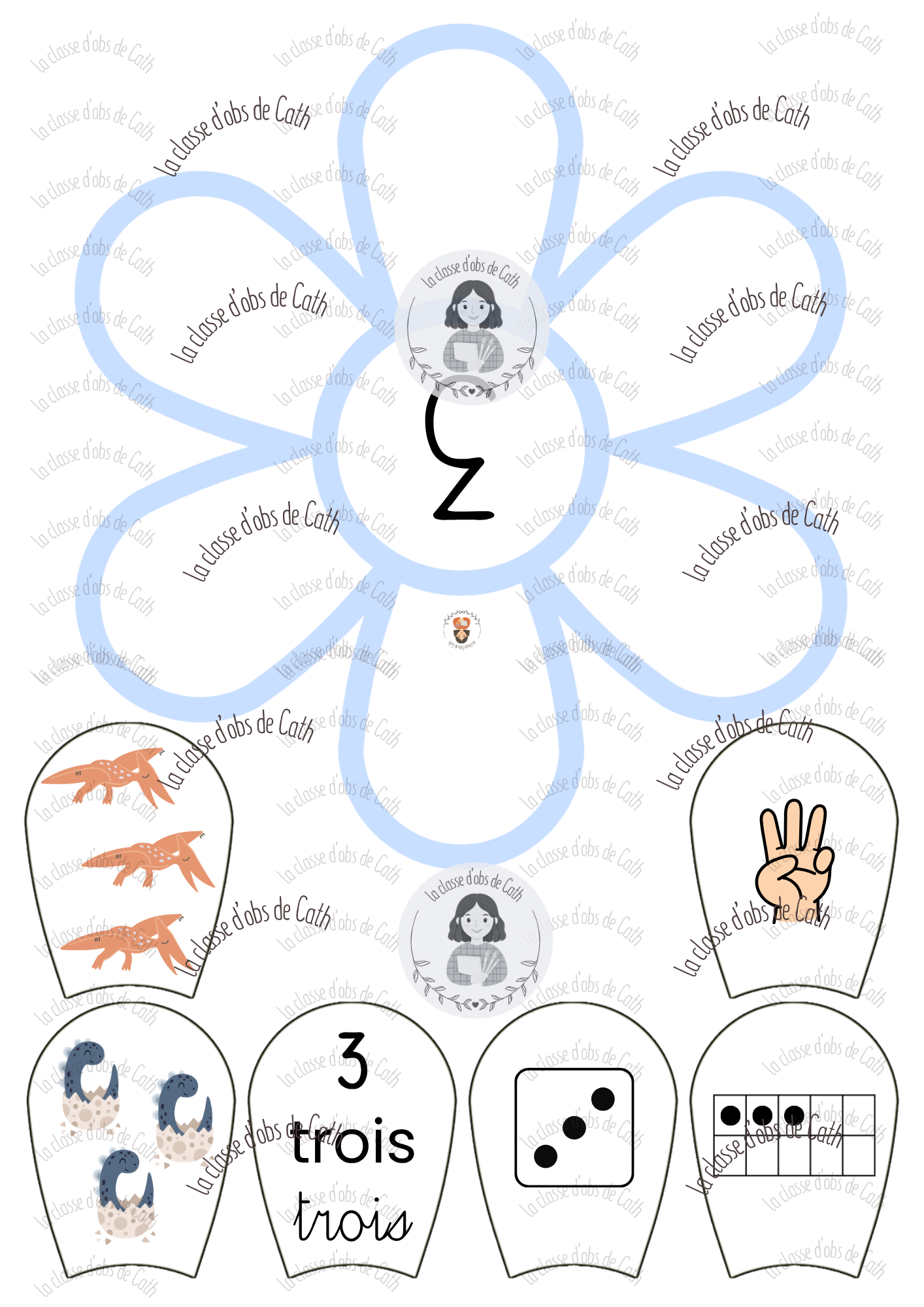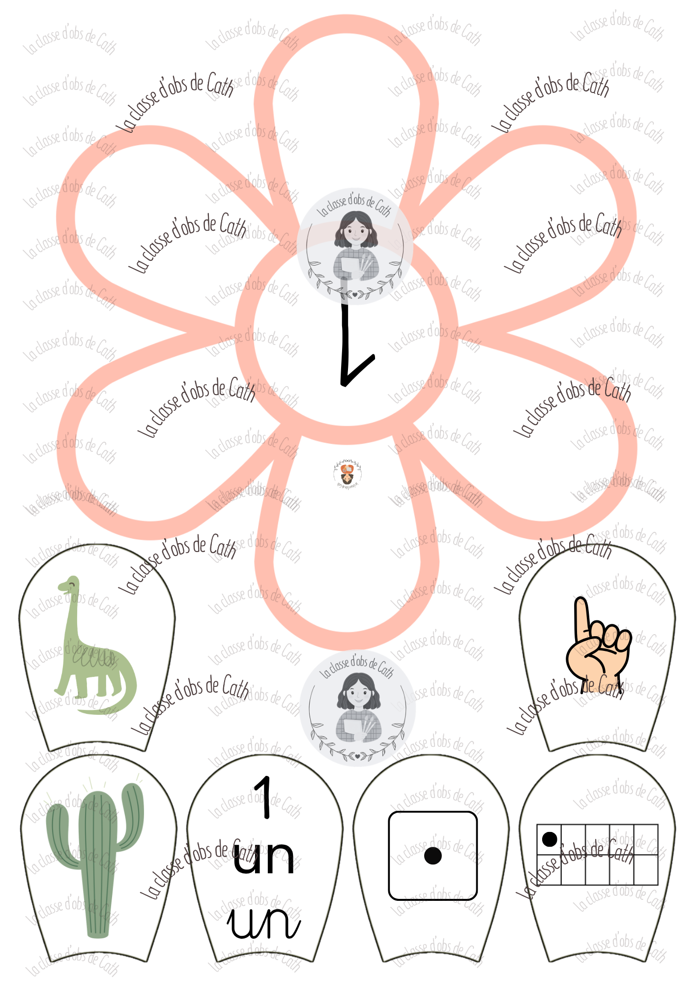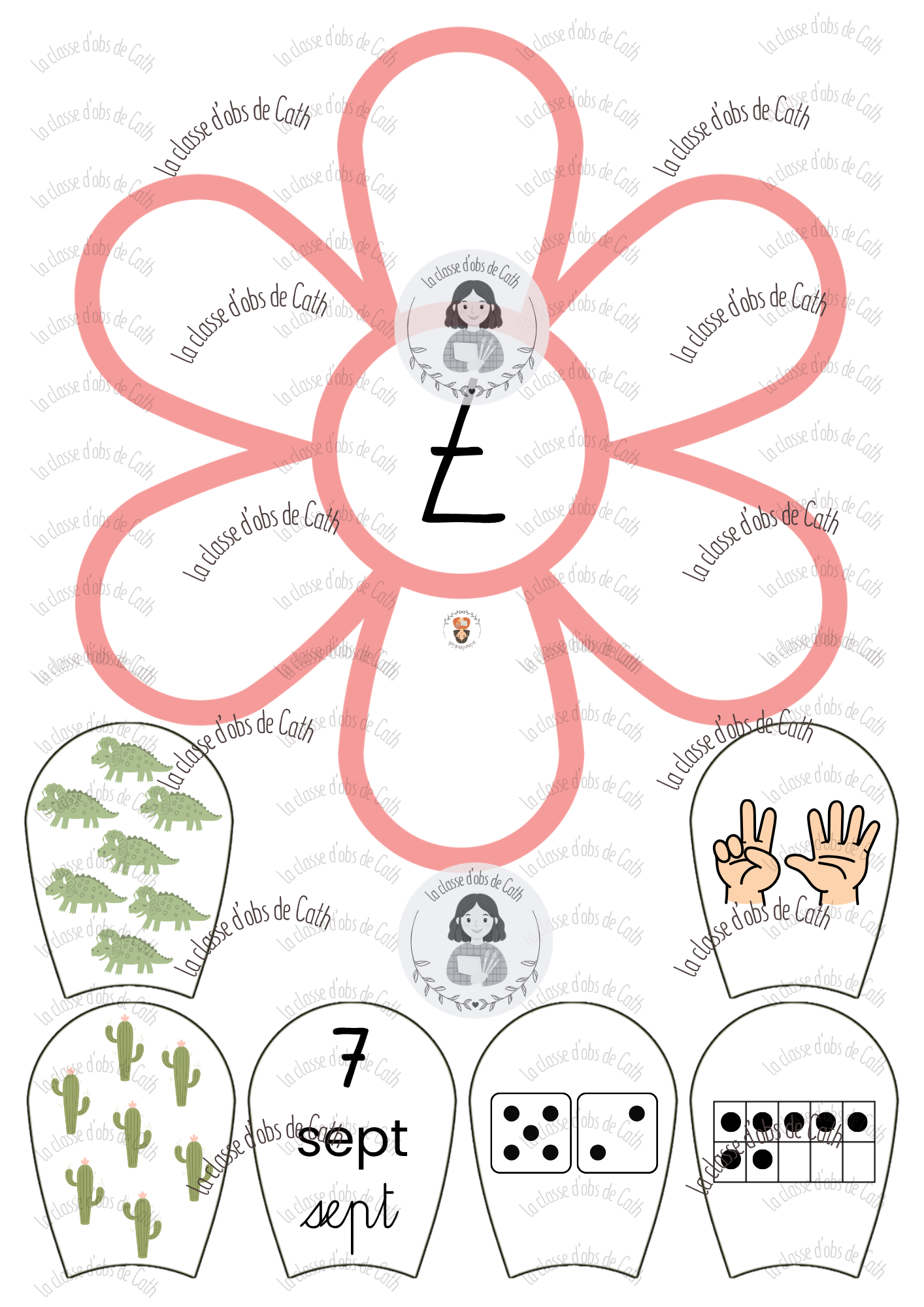 10 fleurs à compter de 1 à 10 sur le thème des dinosaures. Chaque fleur porte un chiffre au centre — l’enfant place les pétales correspondants autour de la fleur en associant les différentes représentations du nombre : collection de dinosaures, geste de la main, chiffre écrit, nom du nombre en lettres, constellation de dé et tableau à points.