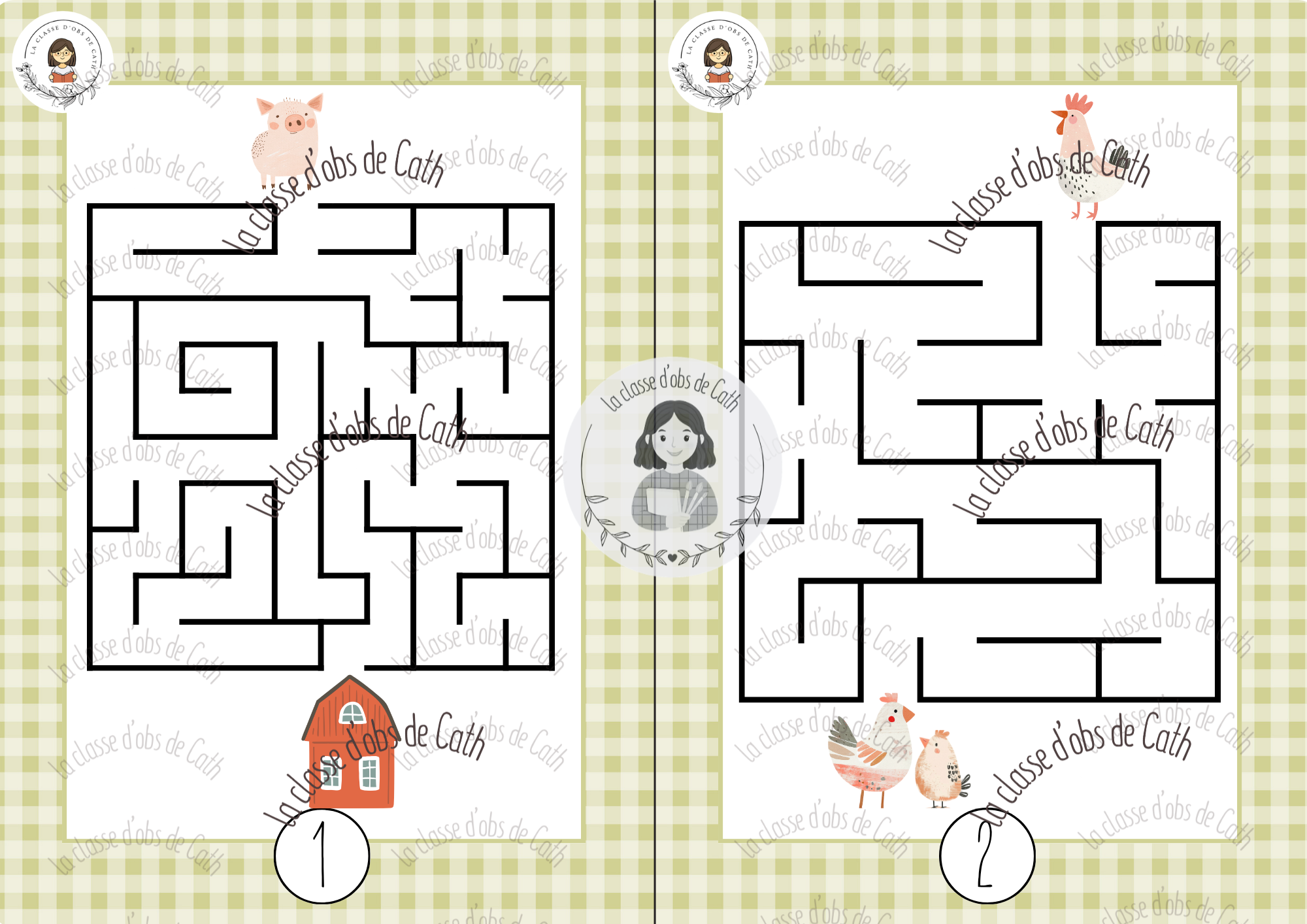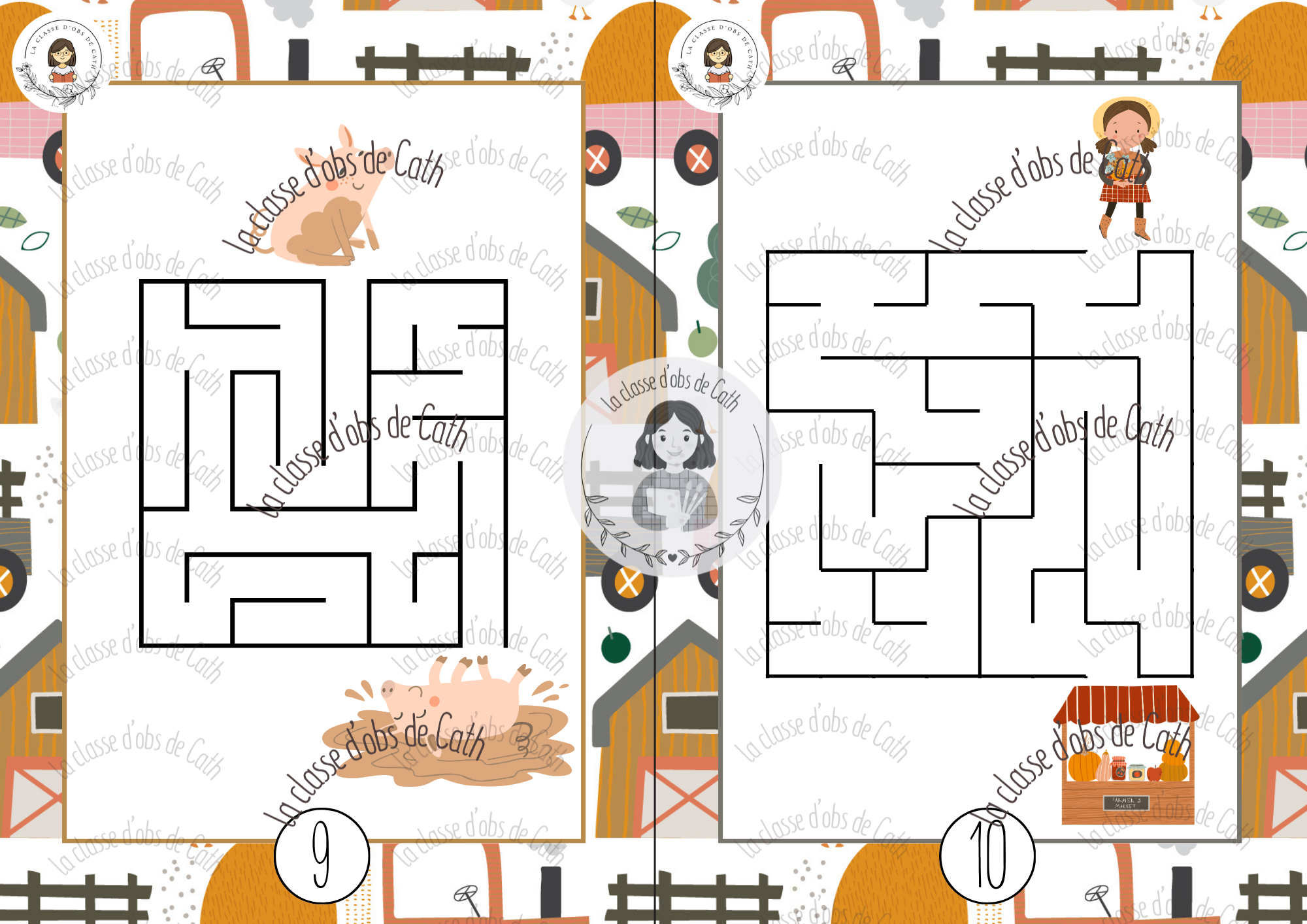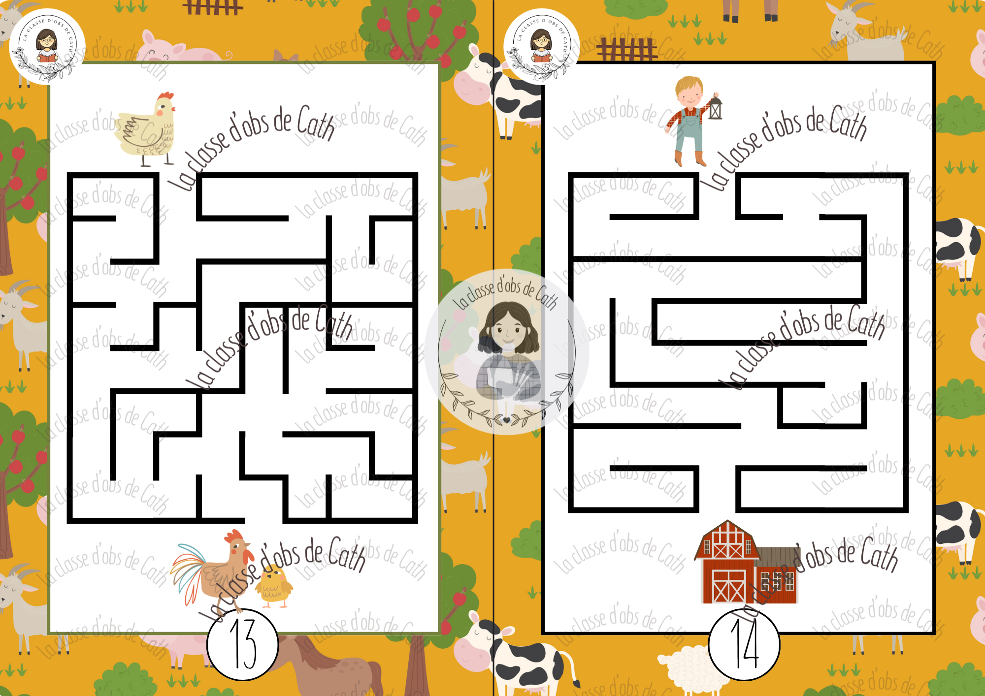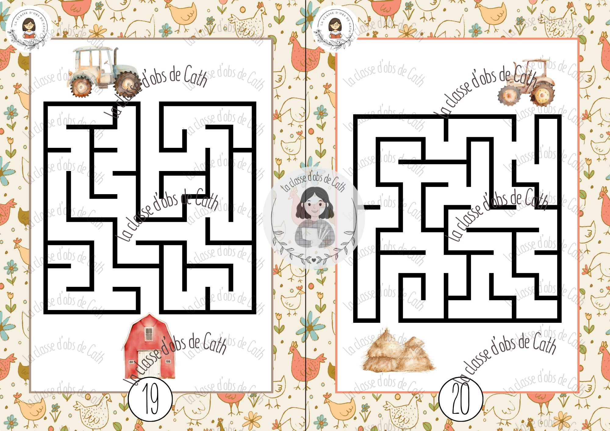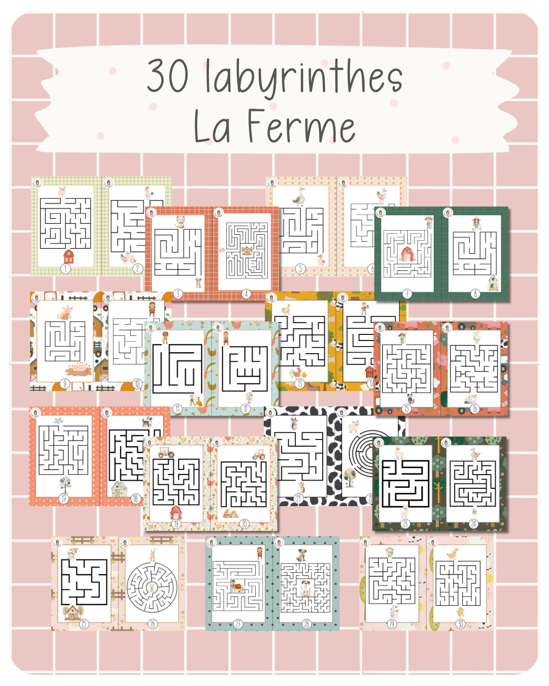 30 labyrinthes thème de la ferme, avec fonds variés et niveaux de difficulté progressifs. À imprimer et plastifier. Utilisables en Suisse (1H-2H) et en France (PS-MS-GS).
