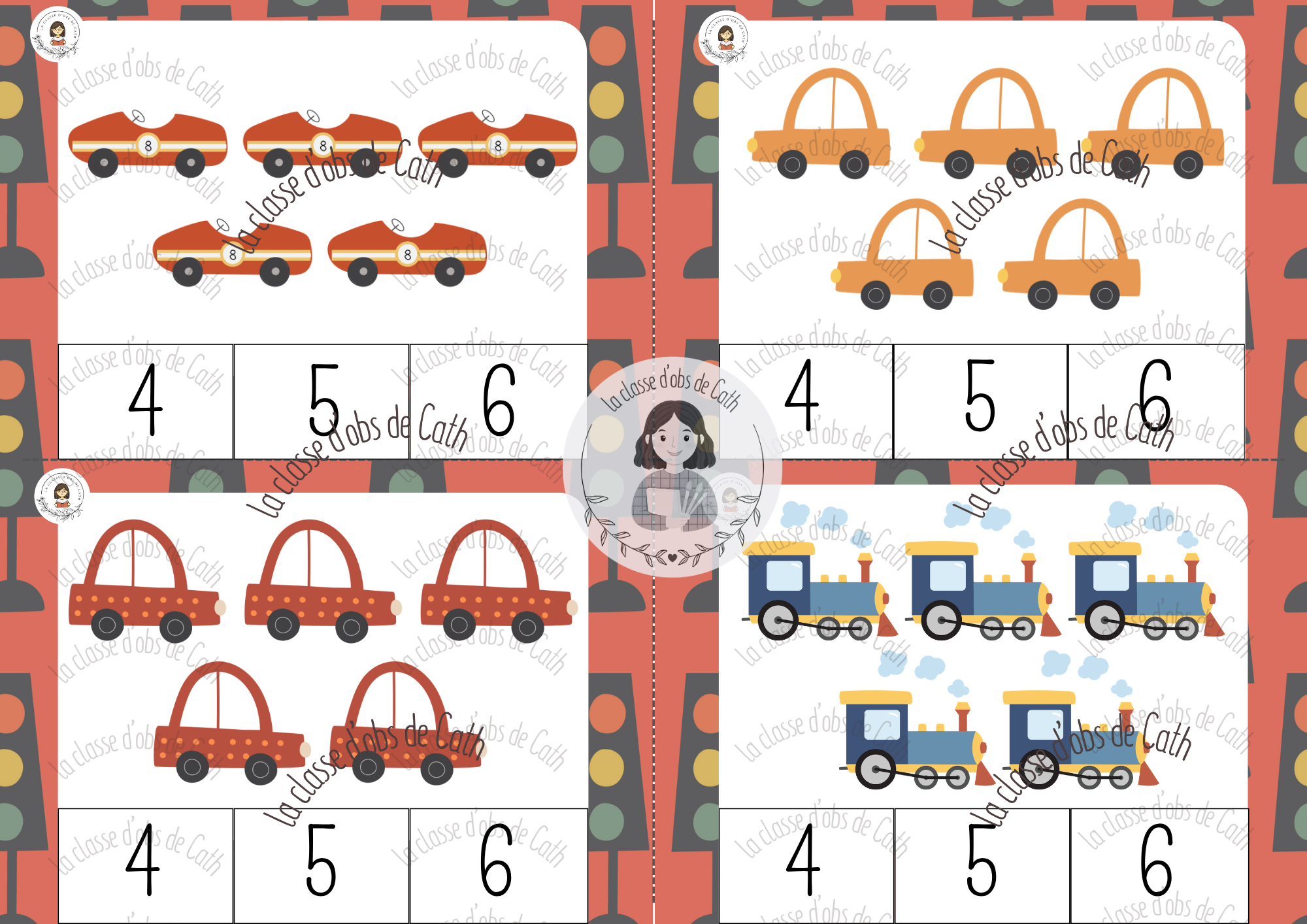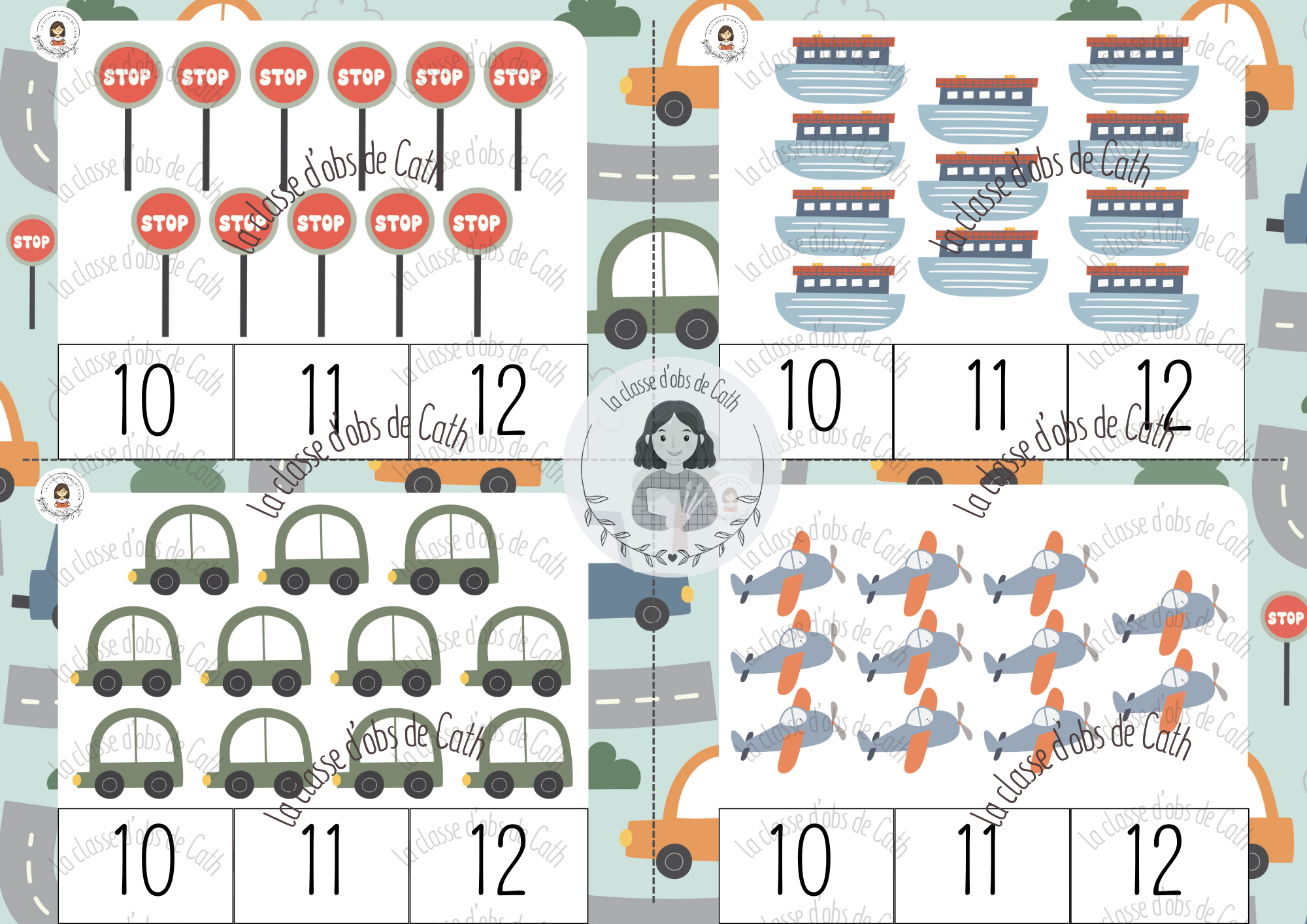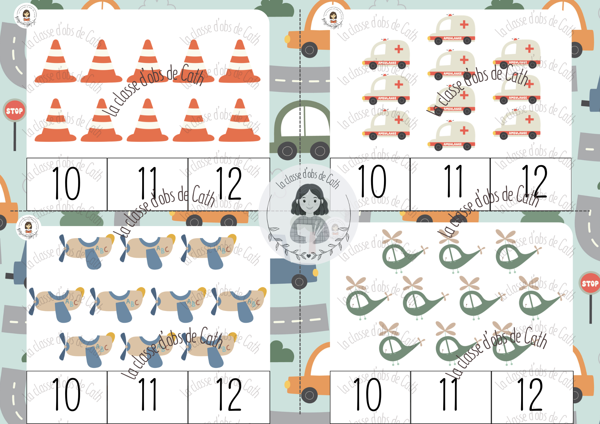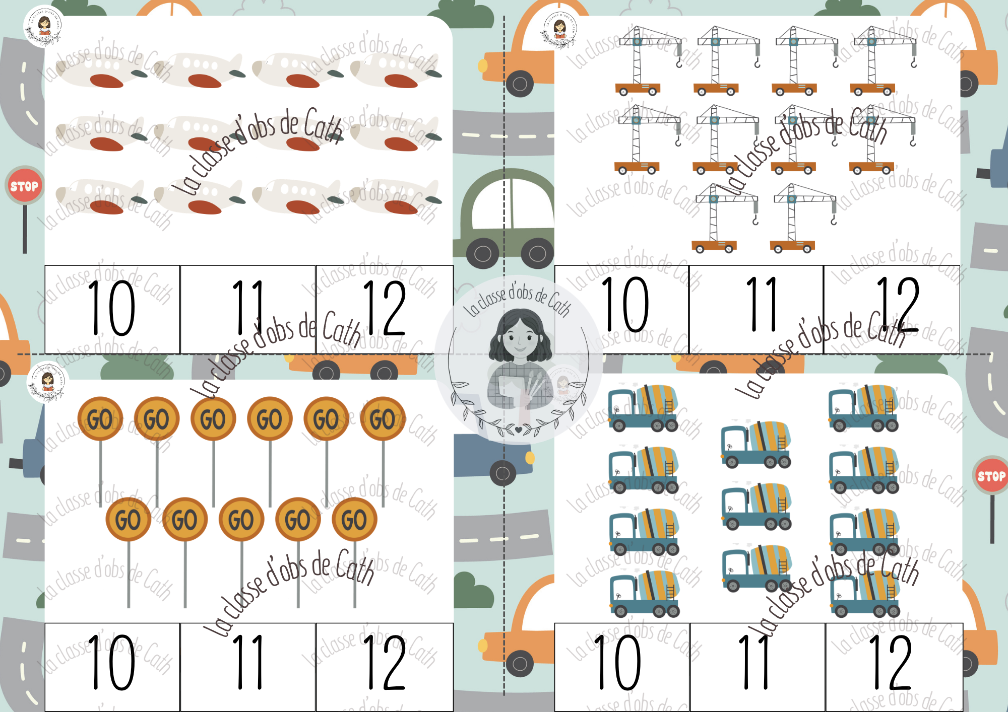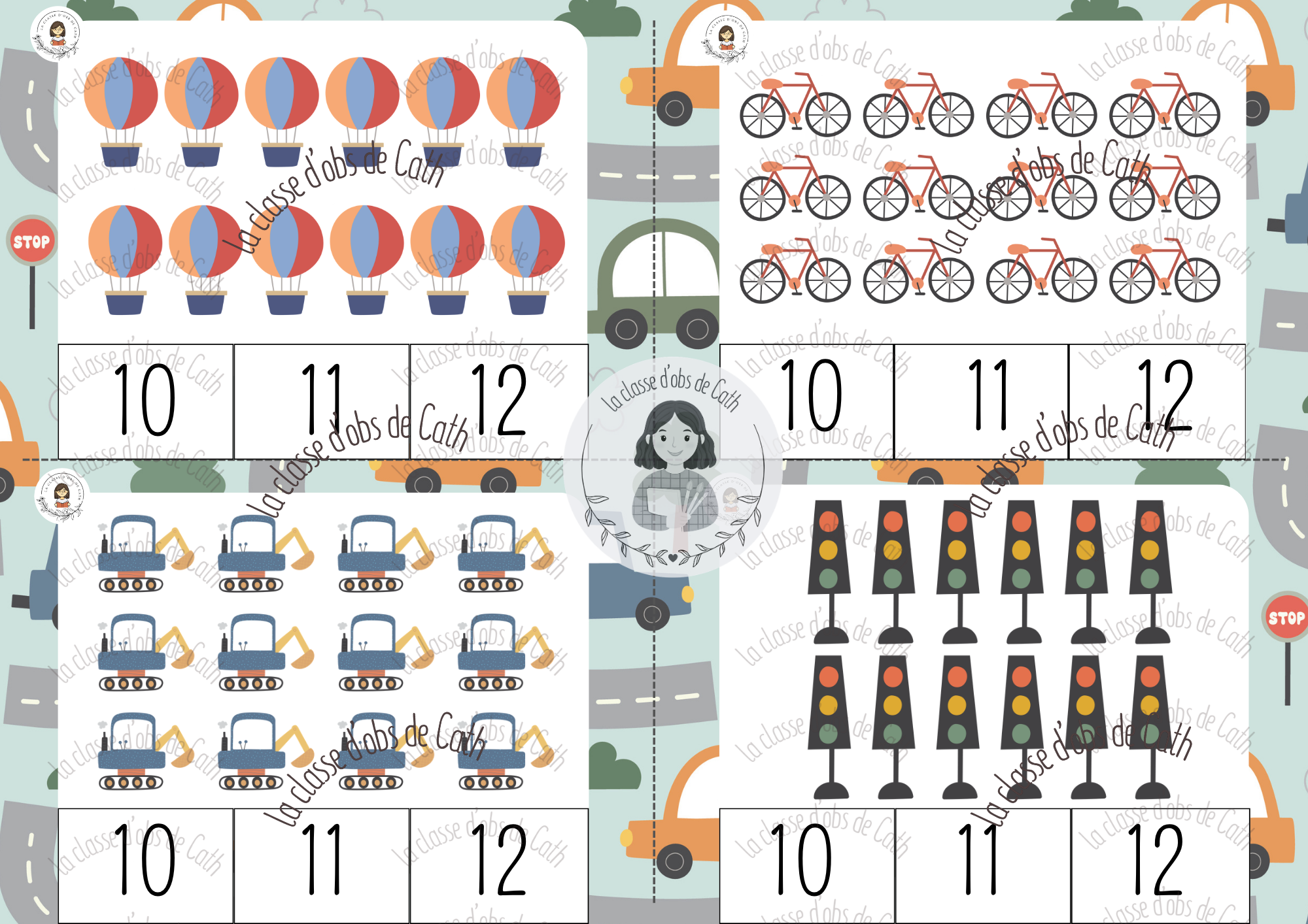 64 cartes à compter de 1 à 12 sur le thème des véhicules, organisées par niveaux progressifs (1-3 / 4-6 / 7-9 / 10-12). Chaque carte présente une collection de véhicules à dénombrer avec les chiffres correspondants, pour favoriser l’association quantité/symbole de manière structurée et ludique.