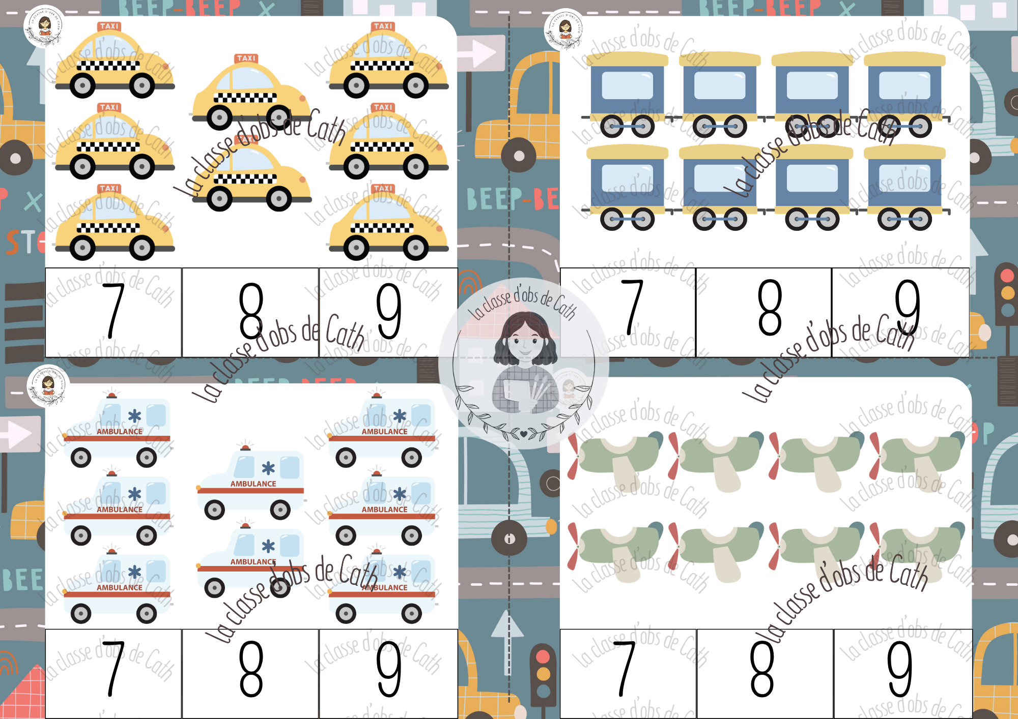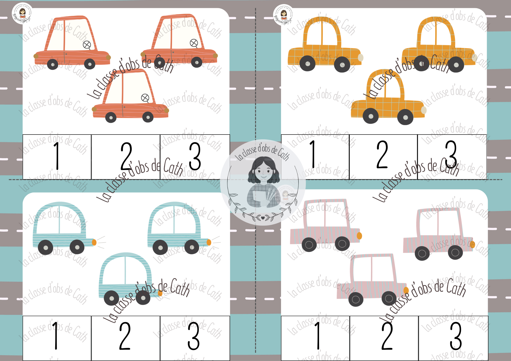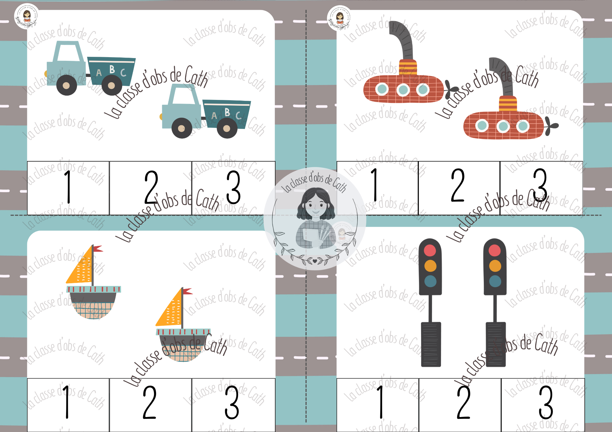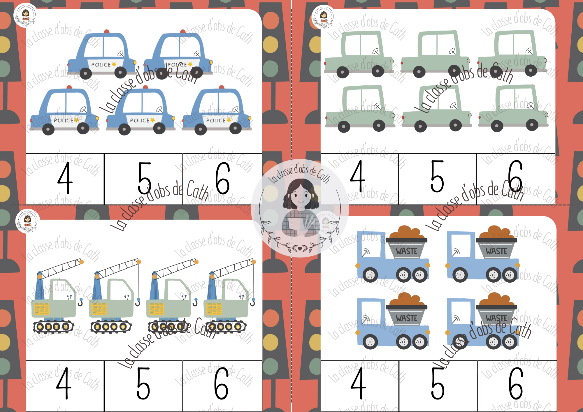 64 cartes à compter de 1 à 12 sur le thème des véhicules, organisées par niveaux progressifs (1-3 / 4-6 / 7-9 / 10-12). Chaque carte présente une collection de véhicules à dénombrer avec les chiffres correspondants, pour favoriser l’association quantité/symbole de manière structurée et ludique.