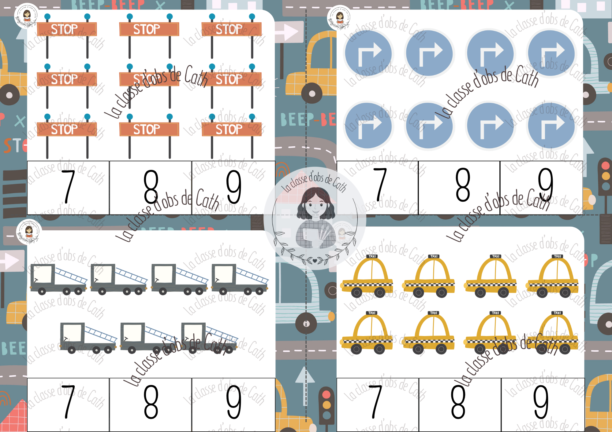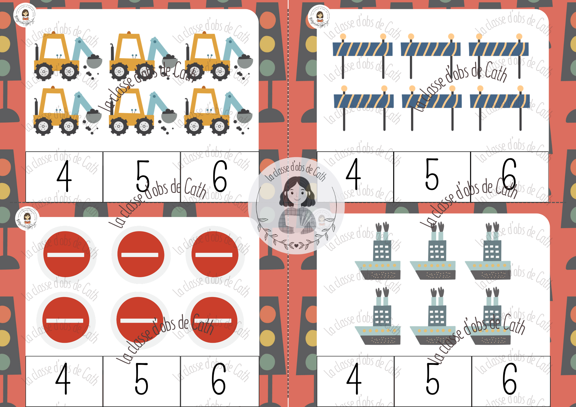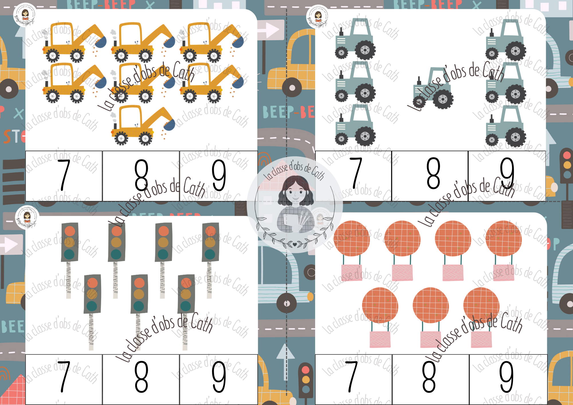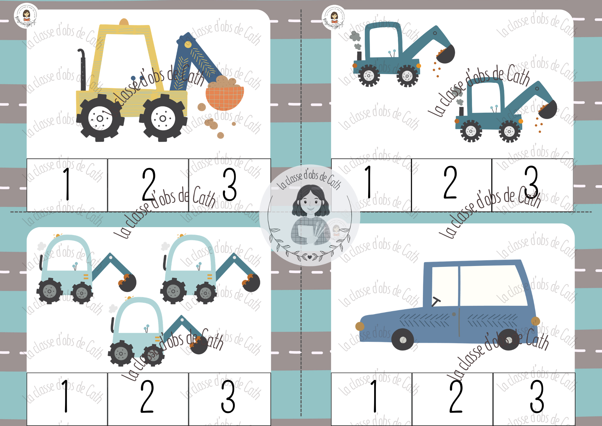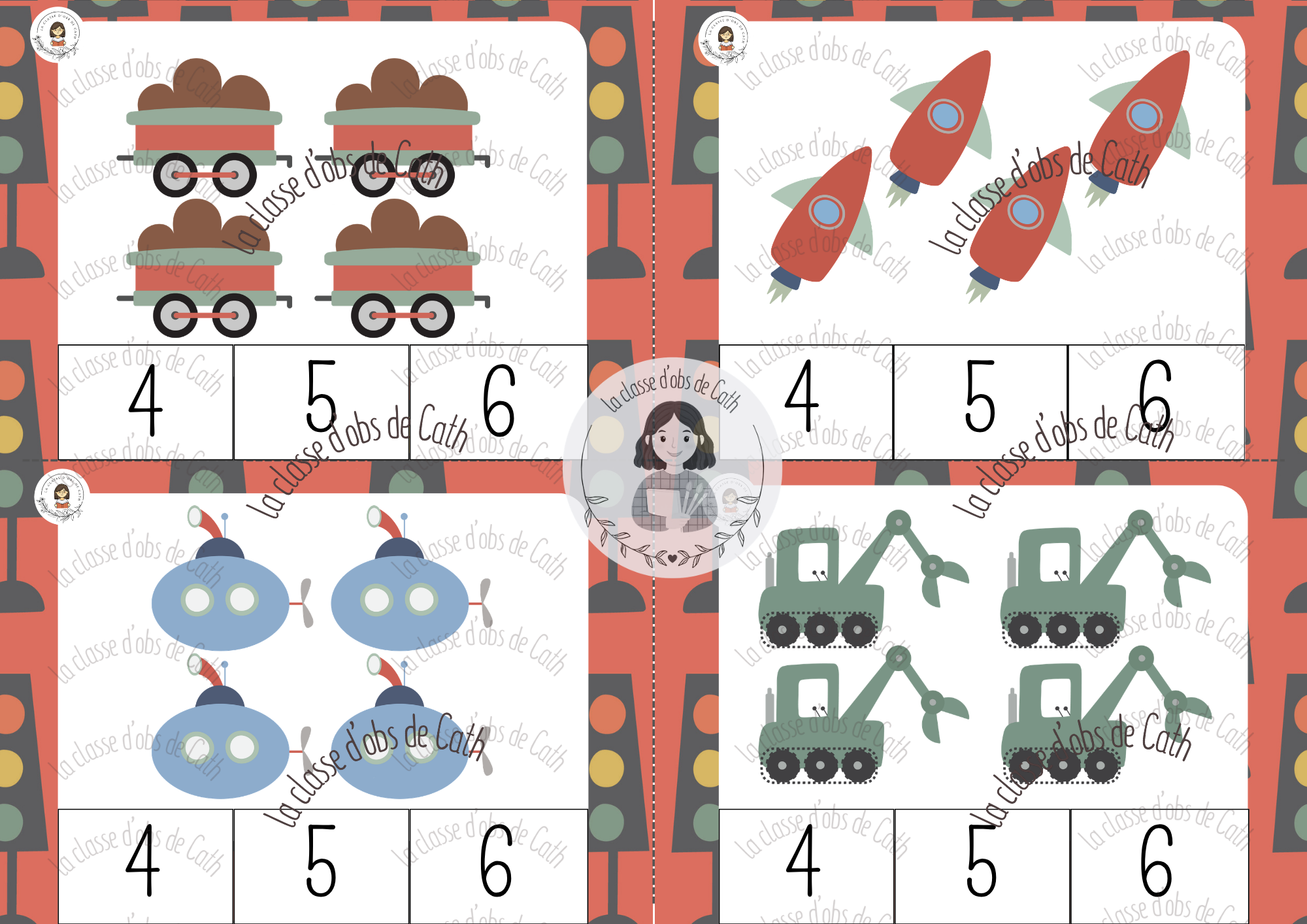 64 cartes à compter de 1 à 12 sur le thème des véhicules, organisées par niveaux progressifs (1-3 / 4-6 / 7-9 / 10-12). Chaque carte présente une collection de véhicules à dénombrer avec les chiffres correspondants, pour favoriser l’association quantité/symbole de manière structurée et ludique.