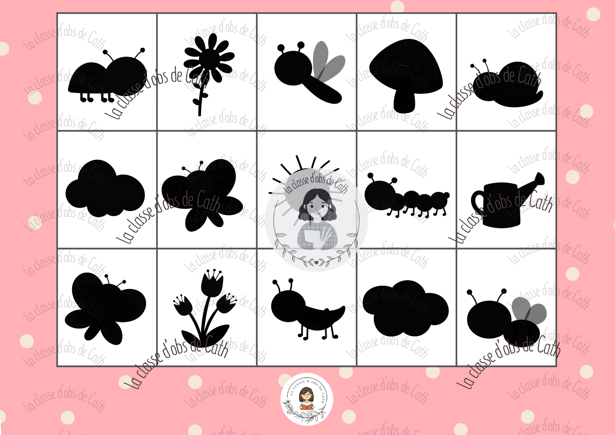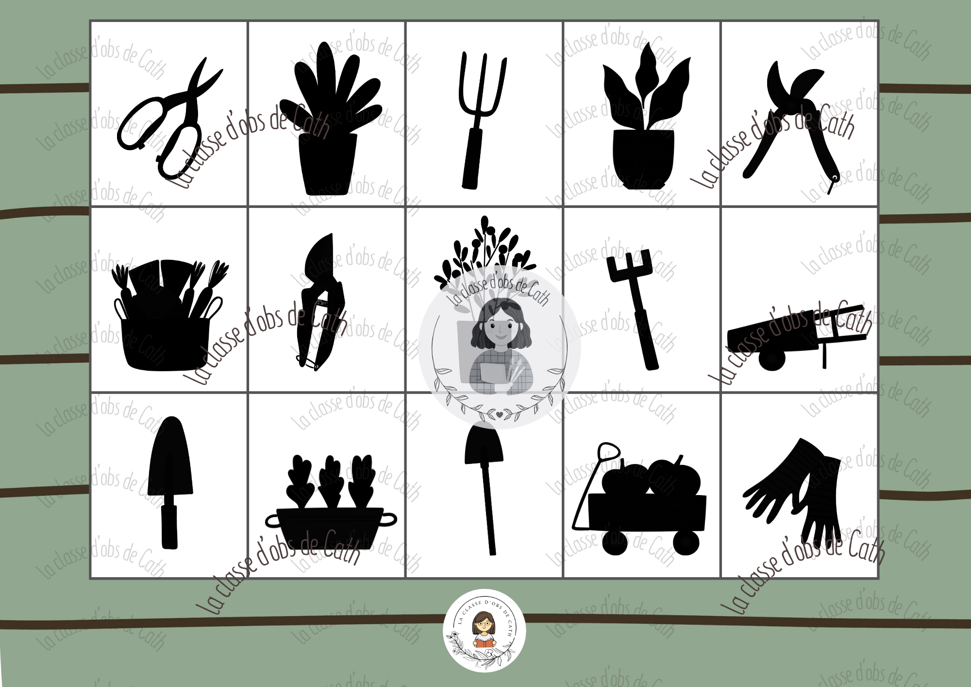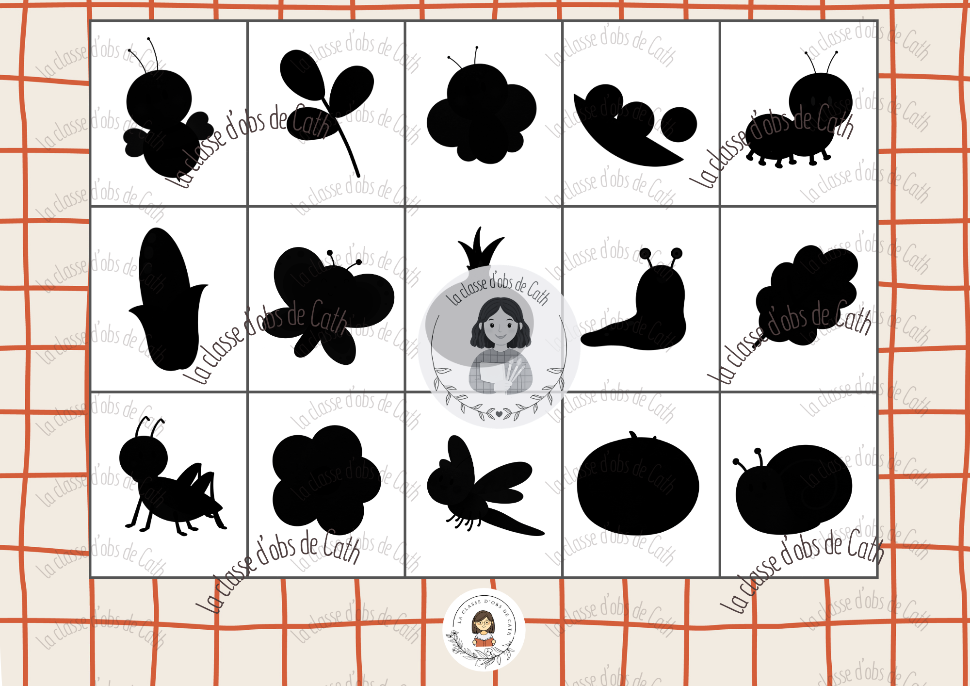 8 planches d’ateliers silhouettes sur le thème « Au jardin ». L’enfant observe attentivement les formes et associe chaque silhouette à l’image correspondante — un travail d’observation présenté en grilles 5×3, sans surcharge visuelle.