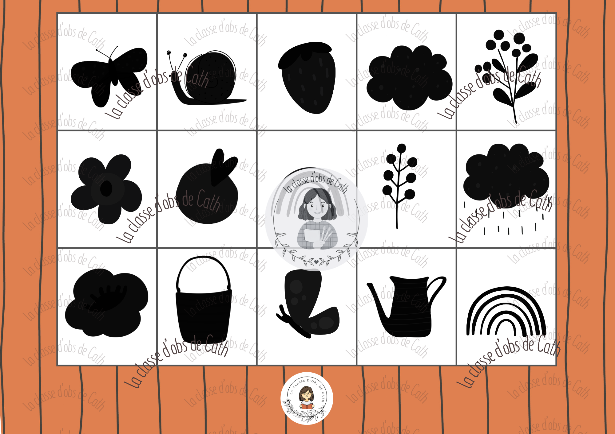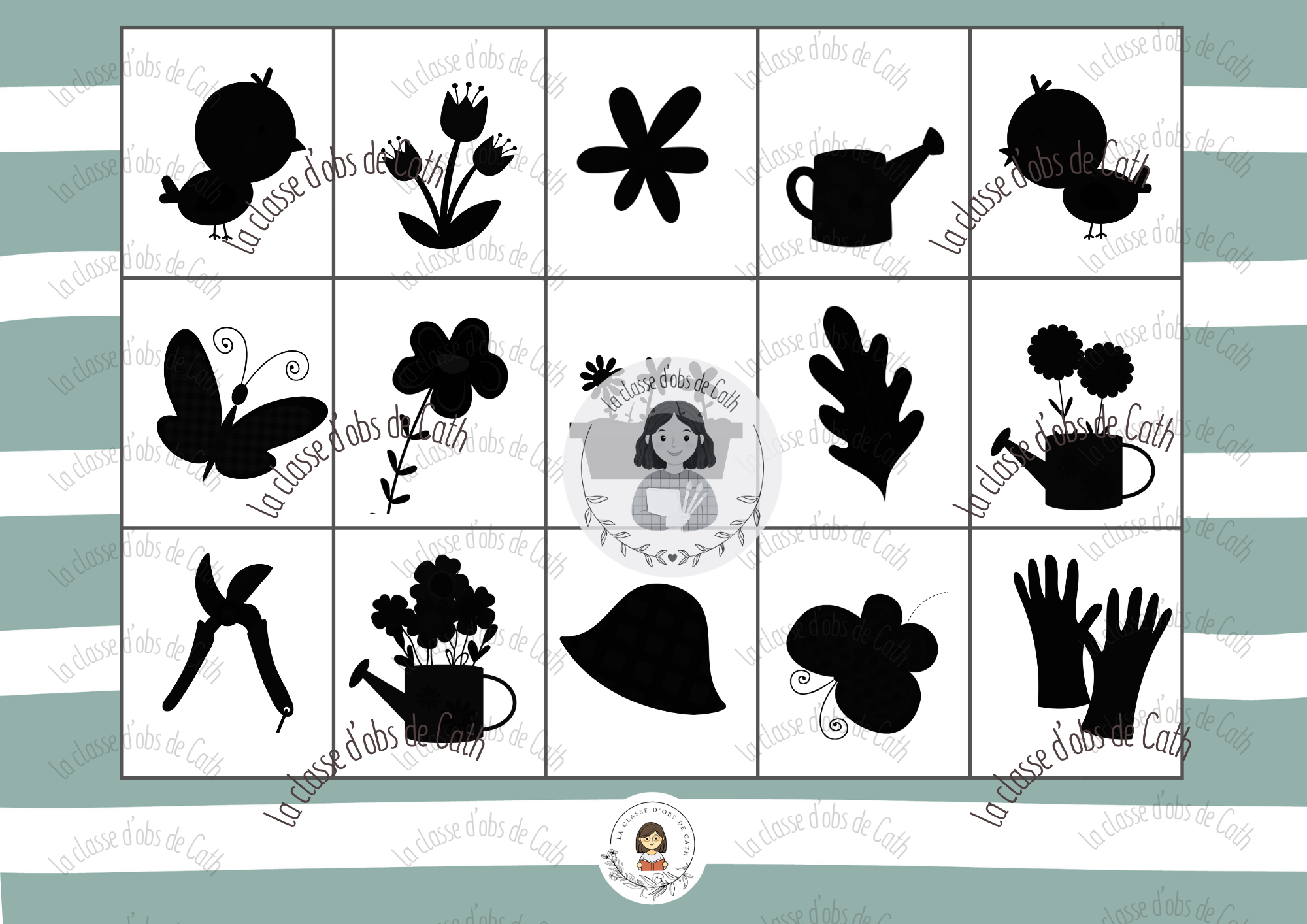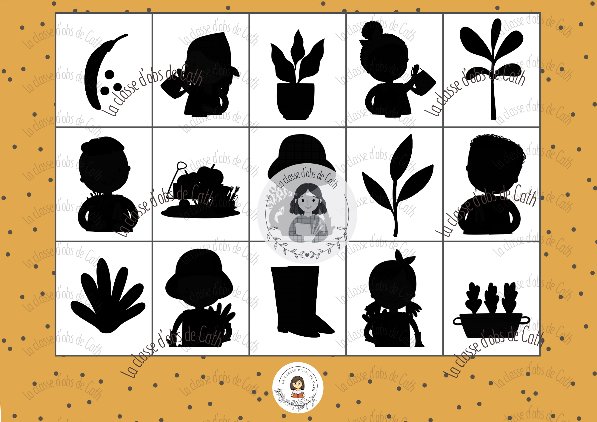 8 planches d’ateliers silhouettes sur le thème « Au jardin ». L’enfant observe attentivement les formes et associe chaque silhouette à l’image correspondante — un travail d’observation présenté en grilles 5×3, sans surcharge visuelle.