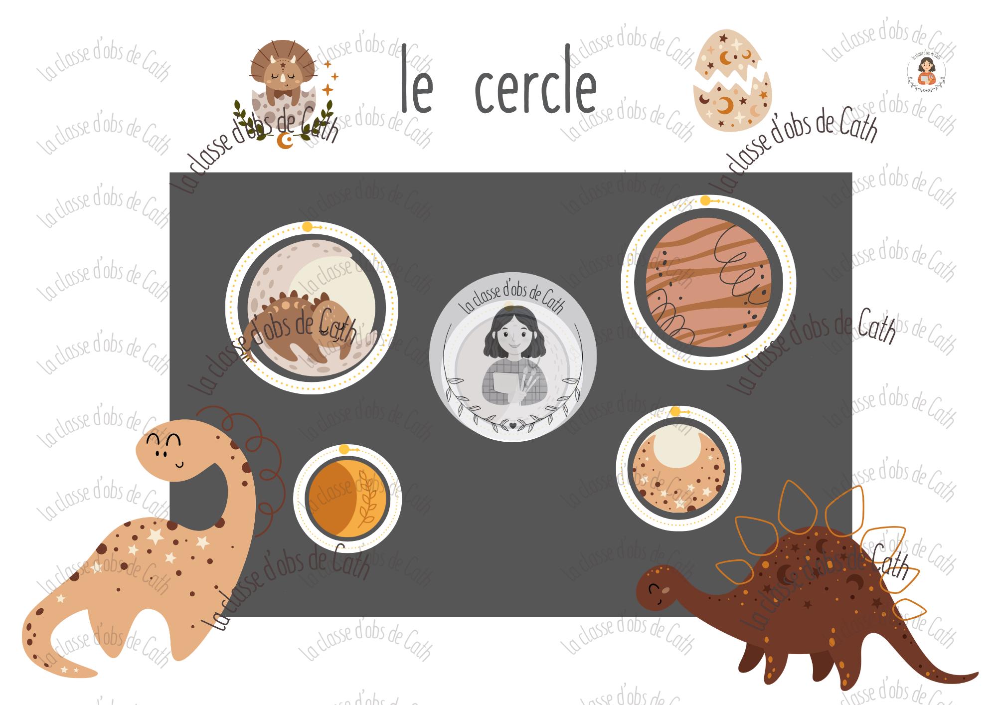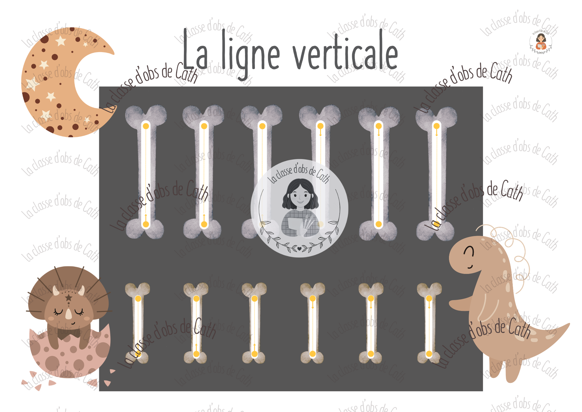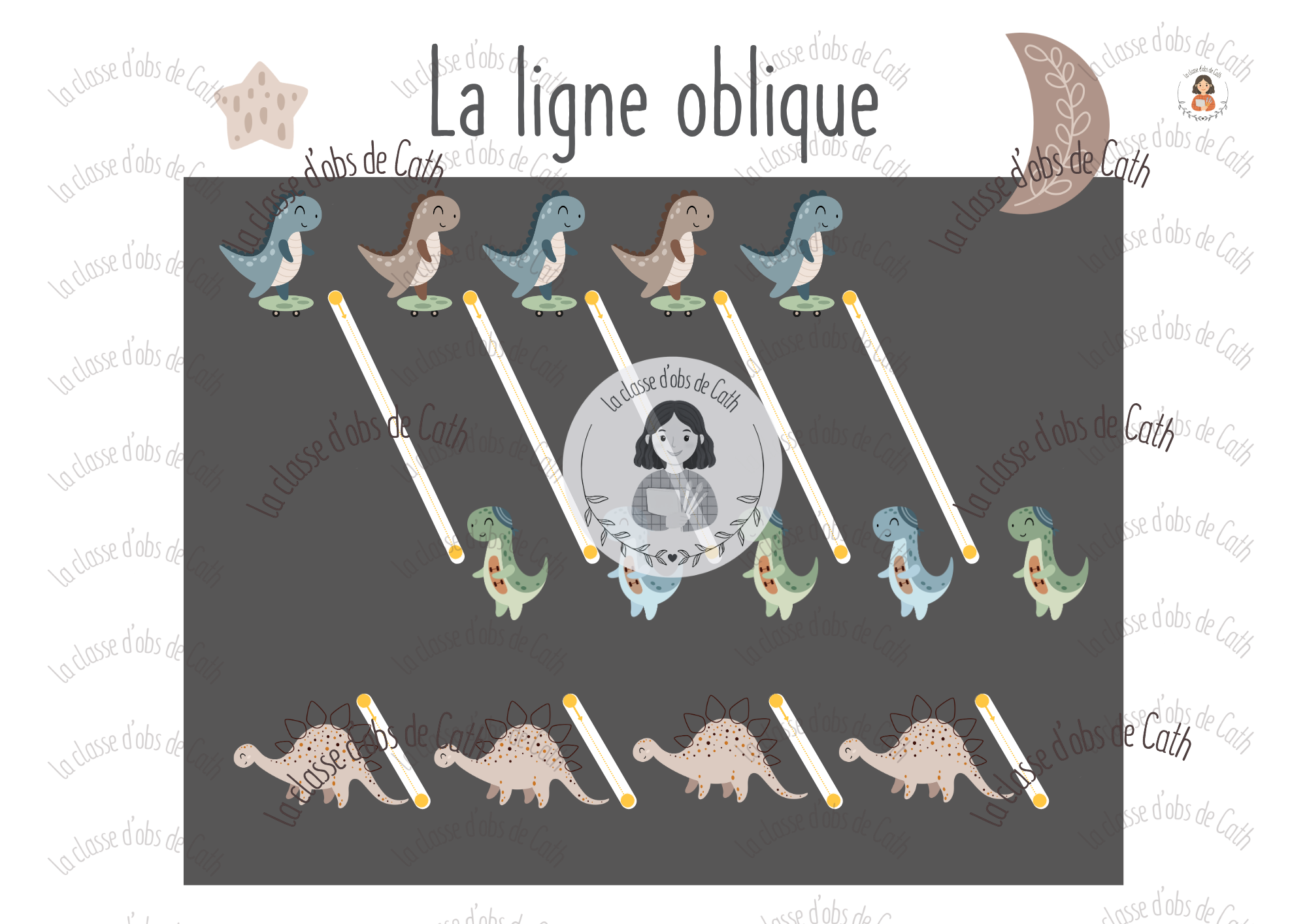 Chaque fiche présente un tracé spécifique dans un cadre visuel soigné sur fond sombre, avec des illustrations dinosaures douces et motivantes. La progression des tracés suit la logique des apprentissages graphomoteurs du cycle 1.
