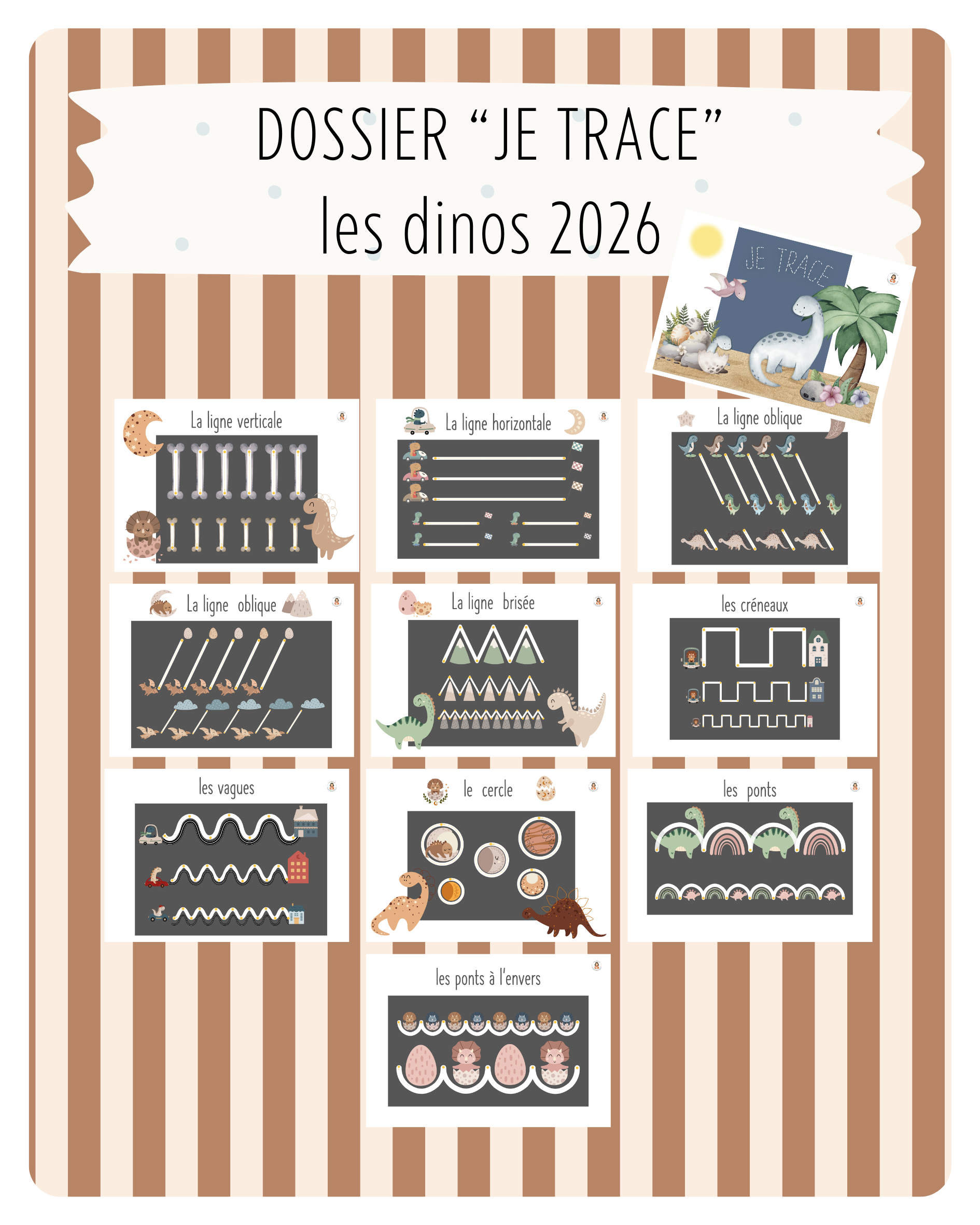 Dossier de graphisme thème dinosaures avec 10 fiches de tracés progressifs. L’enfant s’entraîne à tracer les lignes fondamentales qui précèdent l’écriture : lignes verticales, horizontales, obliques, brisées, créneaux, vagues, cercles, ponts et ponts à l’envers.