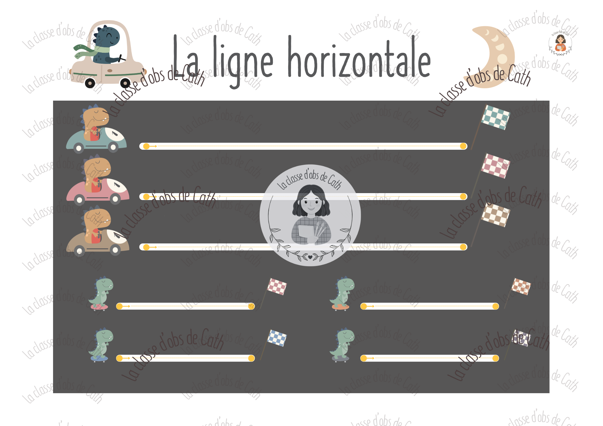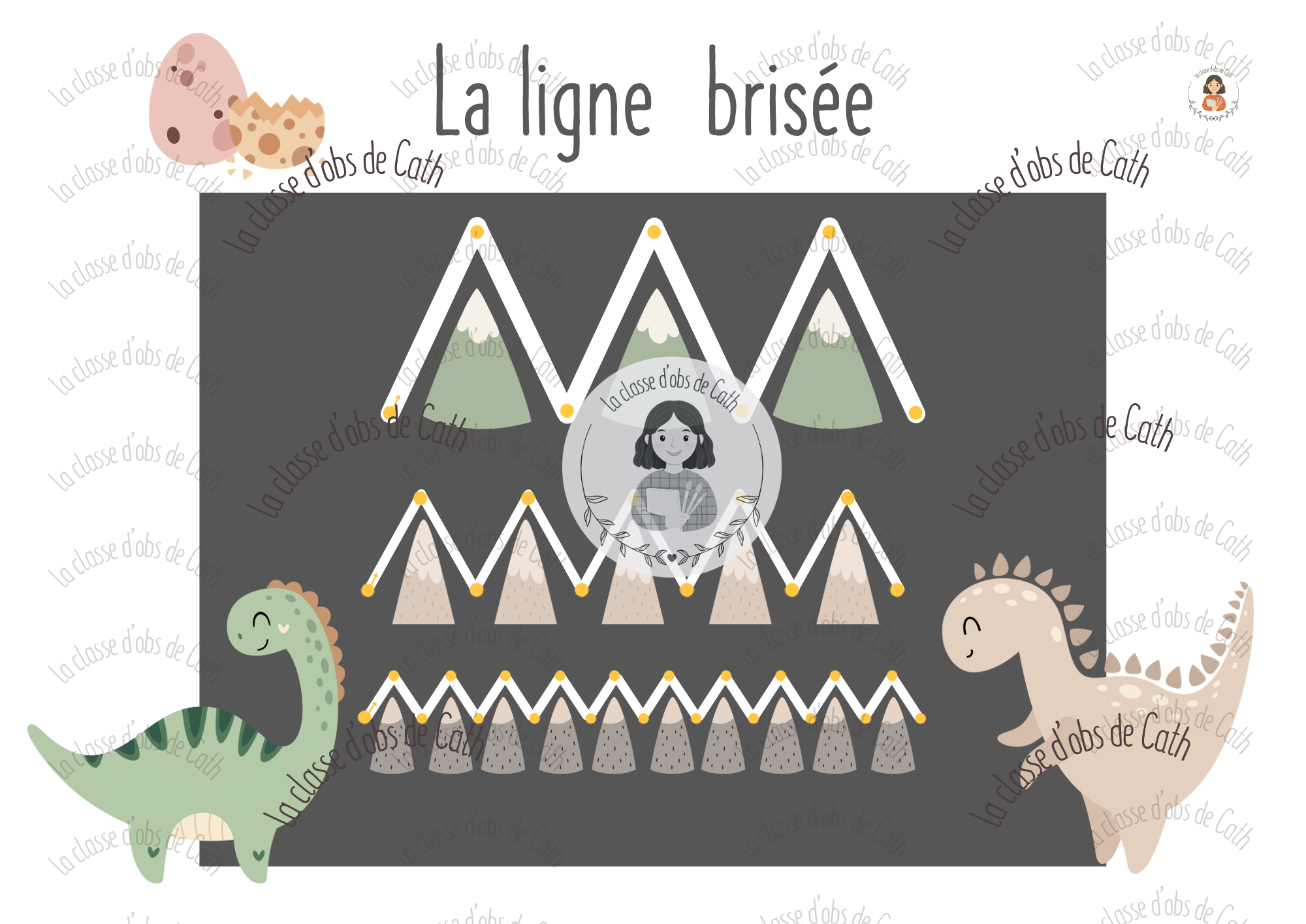 10 fiches de graphisme thème dinosaures — lignes verticales, horizontales, obliques, brisées, créneaux, vagues, cercles, ponts. Plastifiables et réutilisables avec feutre effaçable. Utilisables en Suisse (1H-2H) et en France (PS-MS-GS).